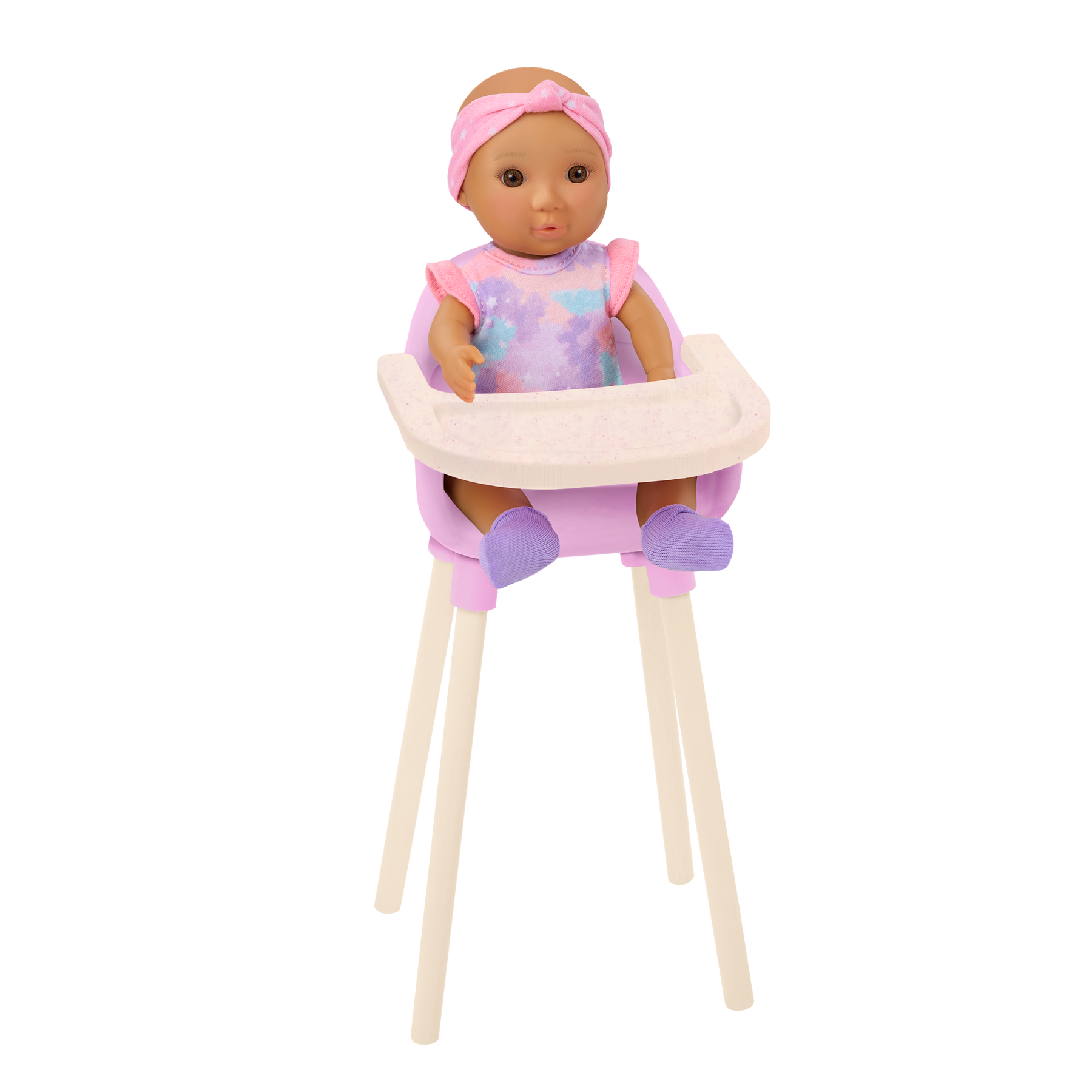 Serve up spoonfuls of joy with the Our Generation Baby Emilia & Mealtime Set! This adorable playset gives kids everything they need to role-play daily meals and fun feeding sessions. Seat Emilia in the high chair and fasten her bib to prep her for the first course. Kids will love "scooping" pretend food from the plates and jars with the utensils. Plus, the interactive baby bottle is filled with pretend milk that really moves inside, while the bags of cookies and yogurt unveil mini food clusters for Emilia to enjoy. A mealtime chart helps kids learn about nutrition and introduces healthy foods, and a range of stickers let them rate each new food they try! Emilia is dressed in an easy-change outfit, featuring a colorful onesie, matching headband, and cozy socks. She also comes with a washcloth and baby wipe container to inspire fun cleanups. Makes a great gift for kids ages 3 years old and up (small parts), encouraging them to create stories and scenarios that involve caring for others.