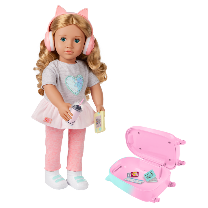 Create endless adventures with Our Generation 18-inch doll Linzi! This adorable travel set lets little explorers play out hours of stories with themed accessories, including a cute cat-ear luggage they can pack and unpack. Plus, it features rolling wheels and an extendable handle for realistic role-play and easy traveling! Linzi is ready to set off in style with a reversible sequin top that kids can flip up and down. She has a huggable soft body and lifelike details to delight doll fans during playtime. Her dark-blue eyes open and close, and her wavy light-blonde hair is fun to style in many ways. For kids who love dress-up, her outfit has easy-open closures to quickly put on and remove. So they can mix, match, and create even more cute looks! Our Generation dolls make a great gift for kids ages 3+ (small parts), encouraging them to imagine their own unique stories.