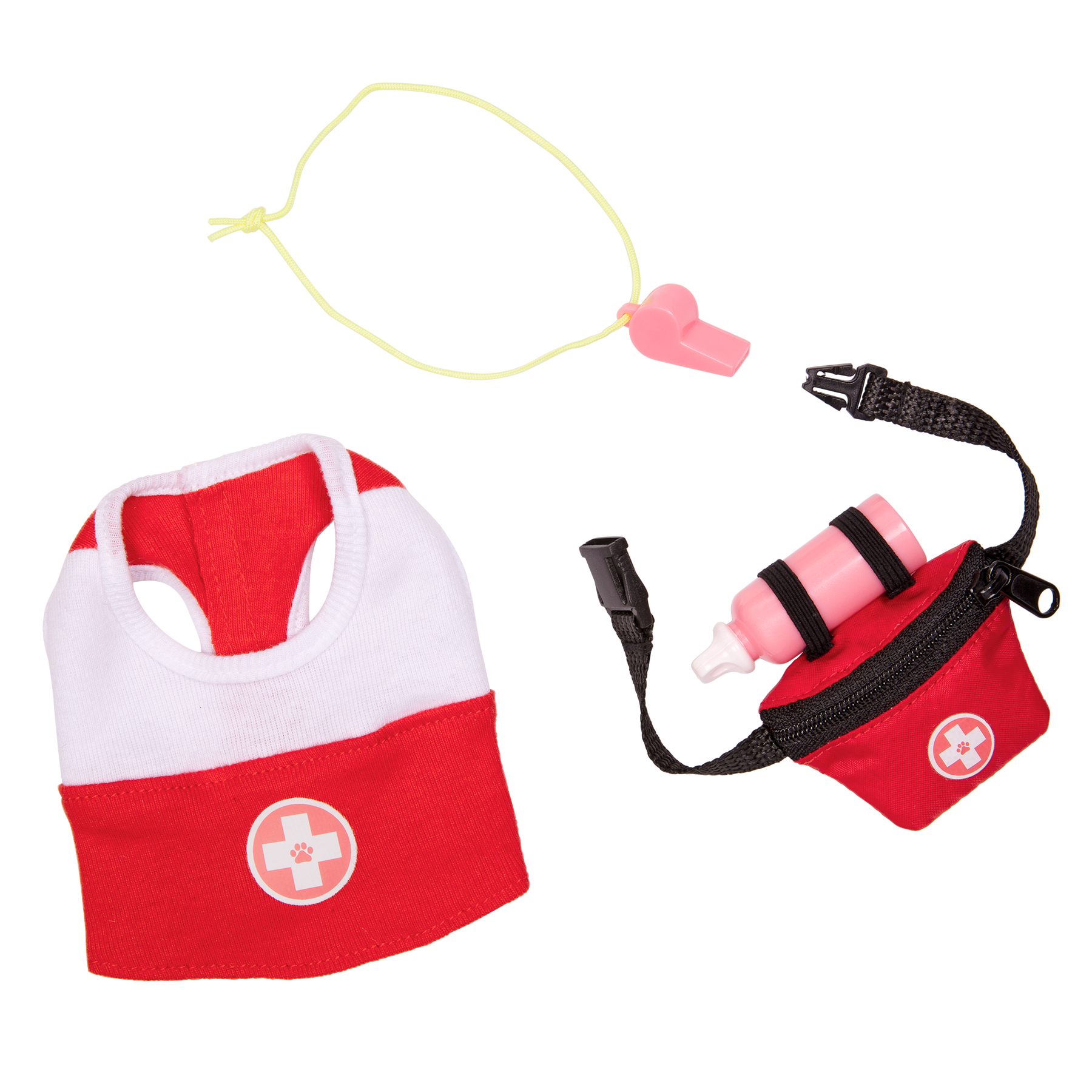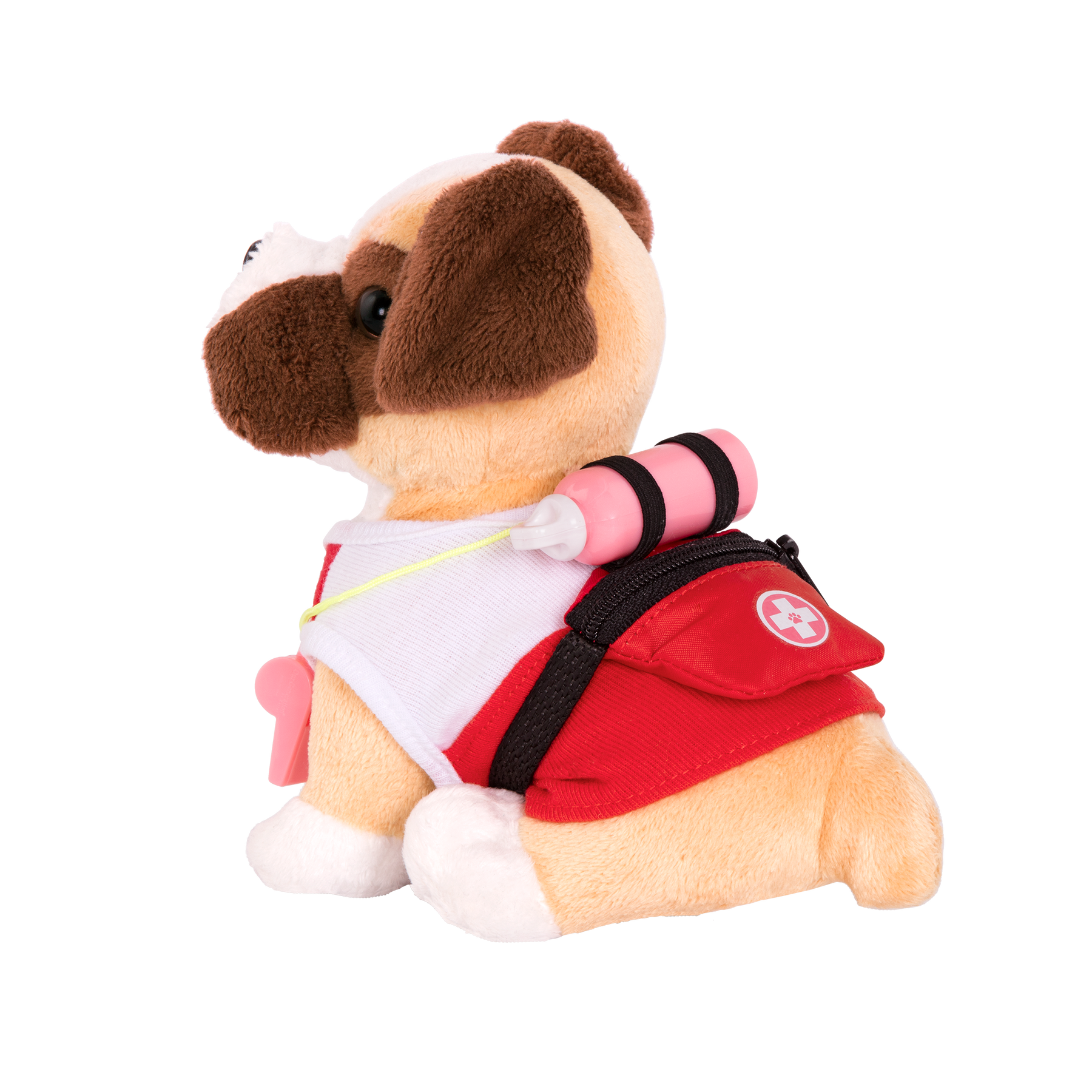 Patrol the beach in style with the Our Generation Lovable Lifeguard set for 12 cm plush pets! This accessory set has all the essentials for your loyal pal to rescue their doll friends. Put on the life vest to help protect your pups during a rescue. It has easy-open closures to quickly put on and remove - lifeguards have no time to waste! The adorable fanny pack easily clips together and has a cute pink water bottle on top for your puppy to stay refreshed. All set? Wrap the whistle around your dog and be on the lookout! (Dolls and pets sold separately)
