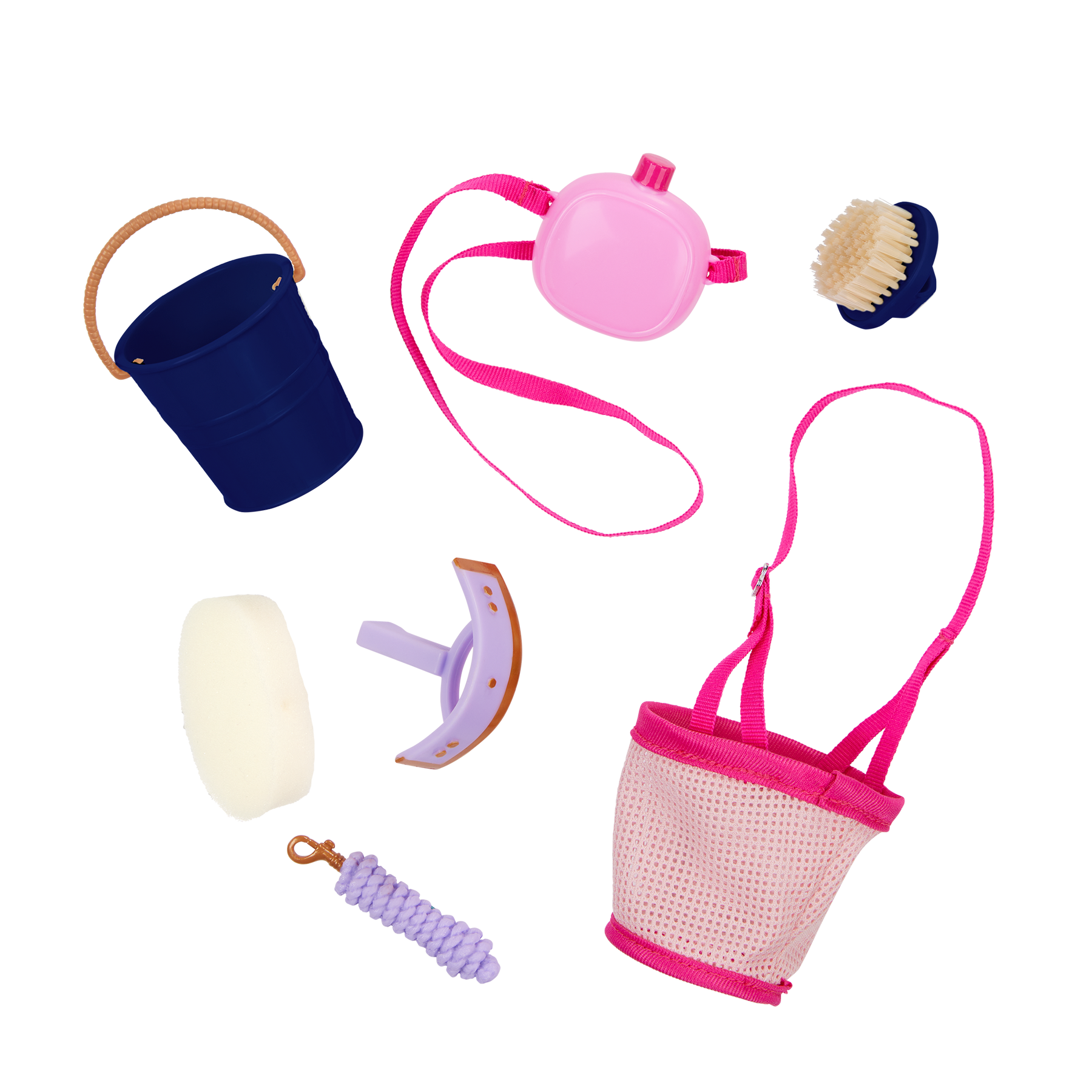 • Includes: Posable horse, saddle with stirrups, saddle blanket, bridle with reins, feed bag, canteen, rope tether, scraper, grooming brush with soft bristles, sponge, and bucket.