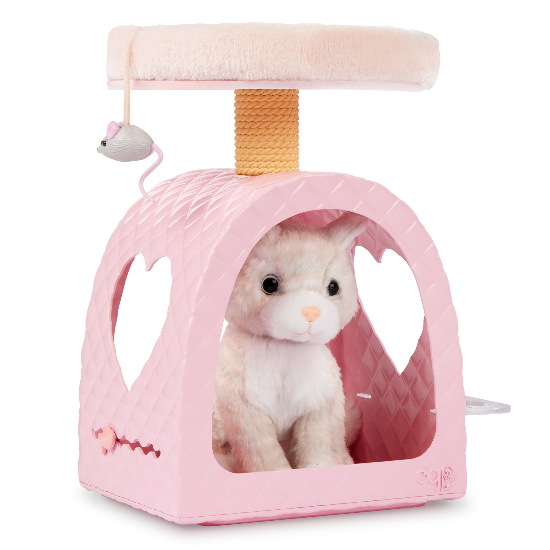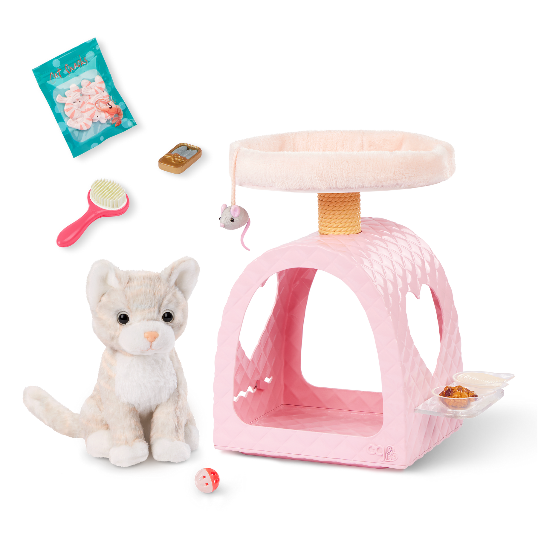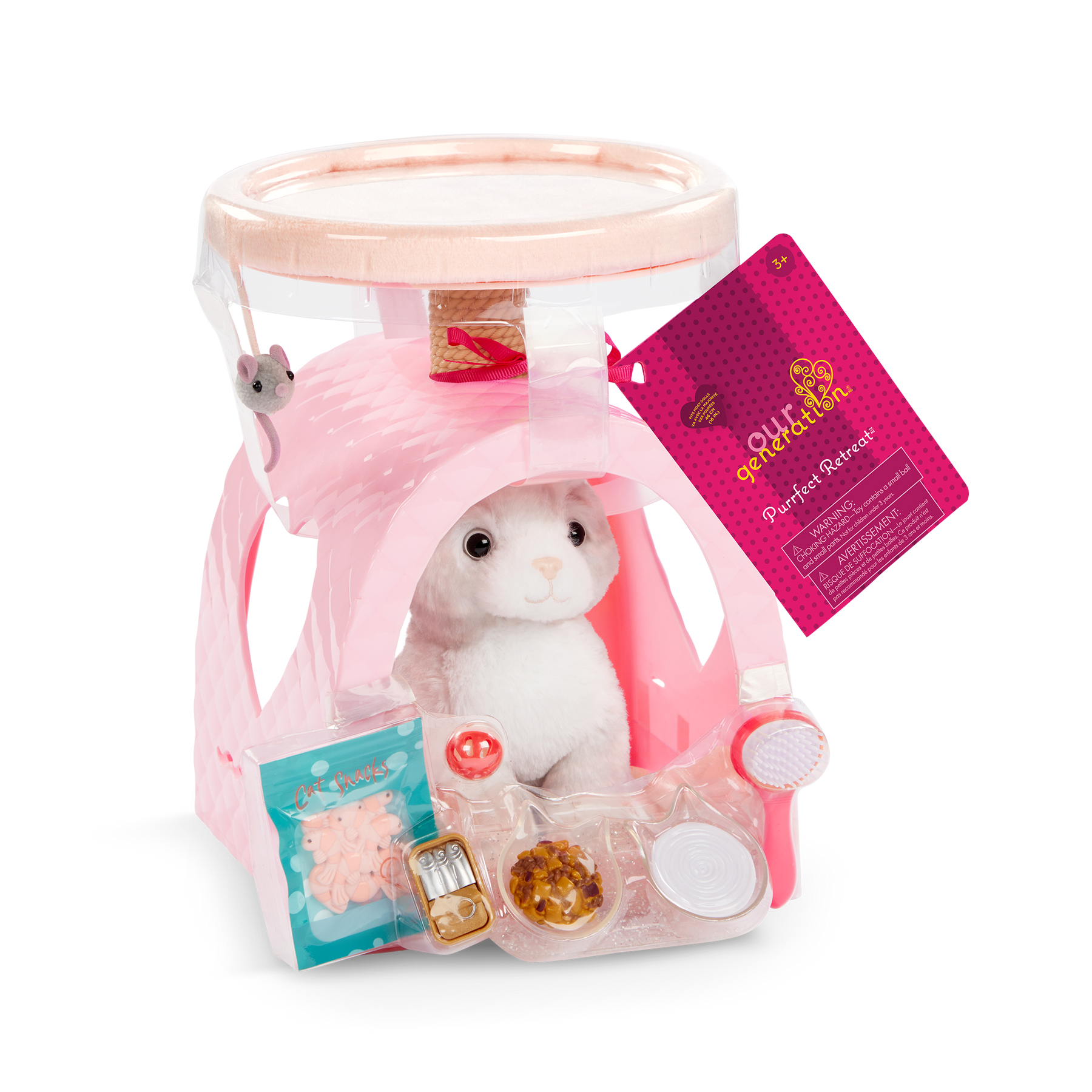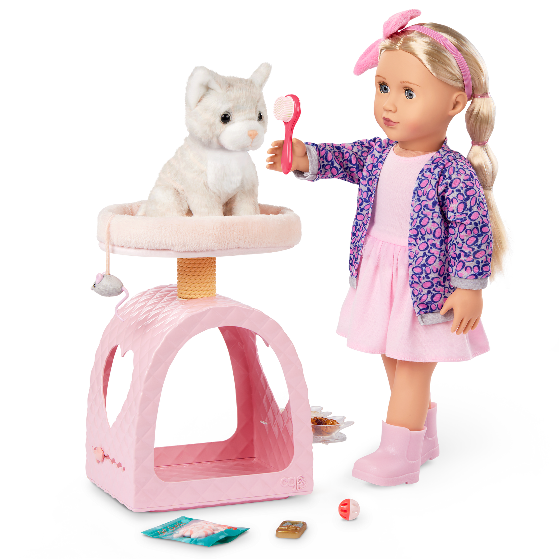 Play, dream, and care for best furry friends with the Our Generation Purrfect Retreat playset, including an adorable cat plush! From bedtime to fun time, this charming cat house inspires sweet storytelling for little animal lovers and their 46 cm dolls. The pink cat dome, scratching post, and cat bed attach together for kids to create a two-story cat tower! Themed accessories like play food let kids serve up delicious meals, and a grooming brush helps keep their feline friends looking fabulous after full days of play! The Our Generation Purrfect Retreat playset is designed with cute details like heart cutouts, an attachable mouse toy, and a feeding shelf to neatly display the food bowls. Makes a wonderful gift for kids ages 3 years old and up (small parts), encouraging them to create their own unique stories and pet kingdoms.