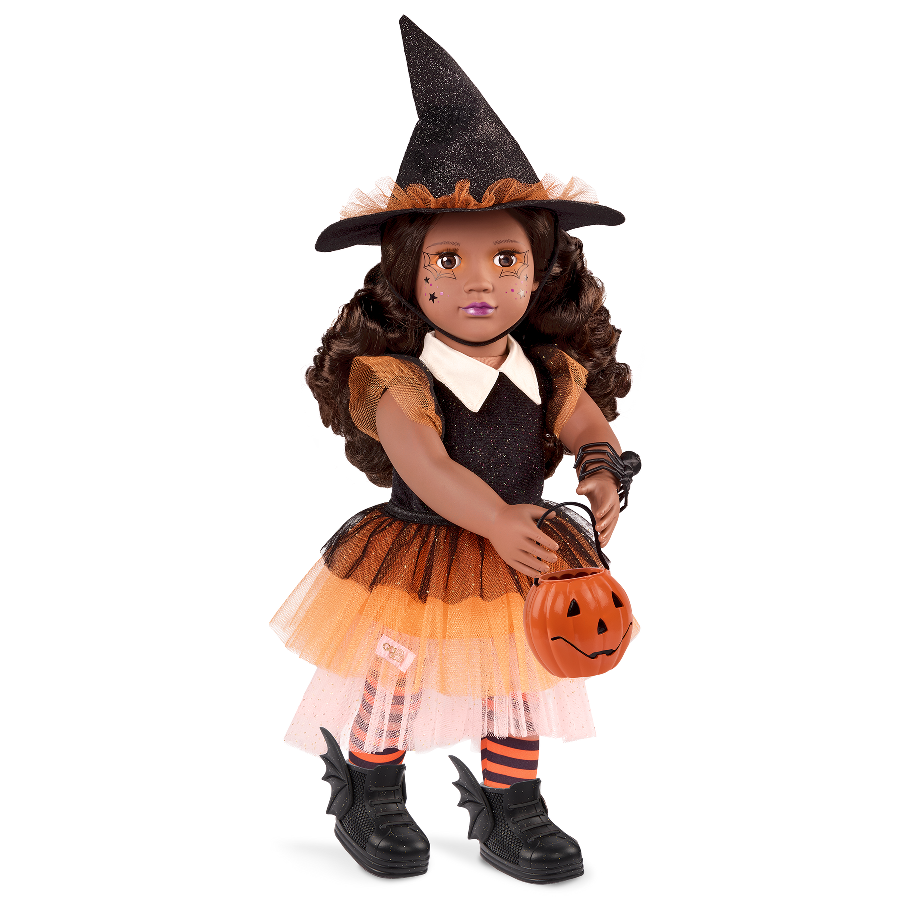 Our Generation limited-edition 46 cm doll Selene captures the playful spirit of Halloween and brings its most exciting traditions to life! Just like the kids who dress up in their favorite costumes to go trick-or-treating, Selene stands out as a whimsical witch with a sparkly hat, striped leggings, and bat-winged shoes—all beautifully accented in orange and black. Enhancing her magical look is a wickedly stylish spider bracelet. Plus, her fabulous face paint features webby eye shadow inspired by the eerie decor seen on haunted houses! She also carries a pumpkin treat bucket resembling the iconic jack-o'-lanterns that kids joyfully carve. Selene has a huggable soft body, dark-brown hair to style, and lifelike dark-brown eyes that open and close. Her witch costume has easy-open closures to quickly put on and remove as kids explore imagination and self-expression. She arrives in special event packaging decorated with Halloween illustrations and includes a certificate of authenticity tucked inside. This Our Generation 2025 limited-edition 46 cm doll makes a wonderful gift for kids ages 3+ (small parts).