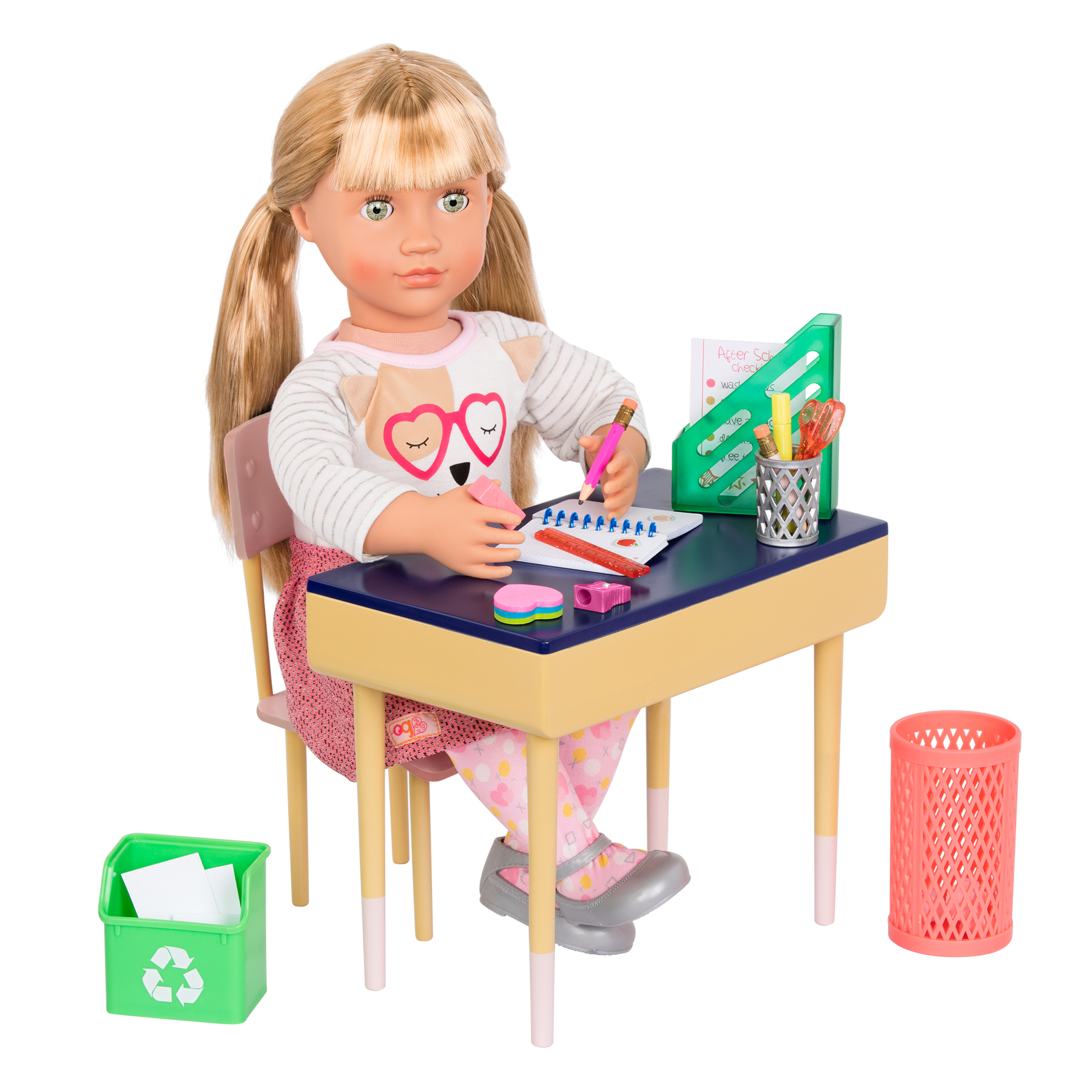 Transform playtime into a creative adventure with the Our Generation Brilliant Bureau set! Your 18-inch dolls will adore the charming desk and chair designed just for them, with cute details that take pretend play to a whole new level. Kids can display the sharpener, eraser, and notepad on the spacious desktop and tick off their after-school checklist to kick off playtime. Plus, the handy pencil holder fits supplies like pencils, a ruler, and scissors to keep them in reach. The interactive highlighter adds even more fun with a cap that really pops off! Play the paper fortune teller game and lift the flaps to see what’s in store for your doll’s bright future—like an invitation to a fabulous party! For styling fans, the sticker sheet lets them decorate the notebook, folder, desk, and more as they express their creativity. Makes a great gift for kids ages 3 years old and up (small parts), inspiring hours of imagination and playful learning. Compatible with most 46 cm dolls and doll accessories. Our Generation dolls sold separately.