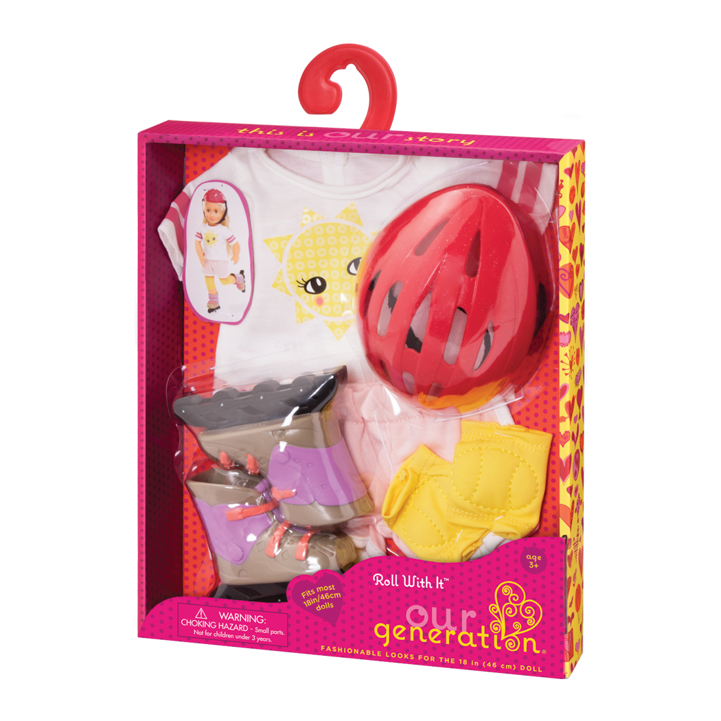The sun is shining and it’s the perfect day to glide toward adventure with the Roll With It rollerblading outfit from Our Generation! This athletic set for 46 cm dolls is just what your dolls need for days of summer fun. Dress them in the adorable T-shirt with a happy sun print and the comfy pink shorts. Safety first! Add the helmet and kneepads to protect her while she glides. Your dolls will have hours of fun rolling around the neighbourhood with you! (Dolls sold separately)
