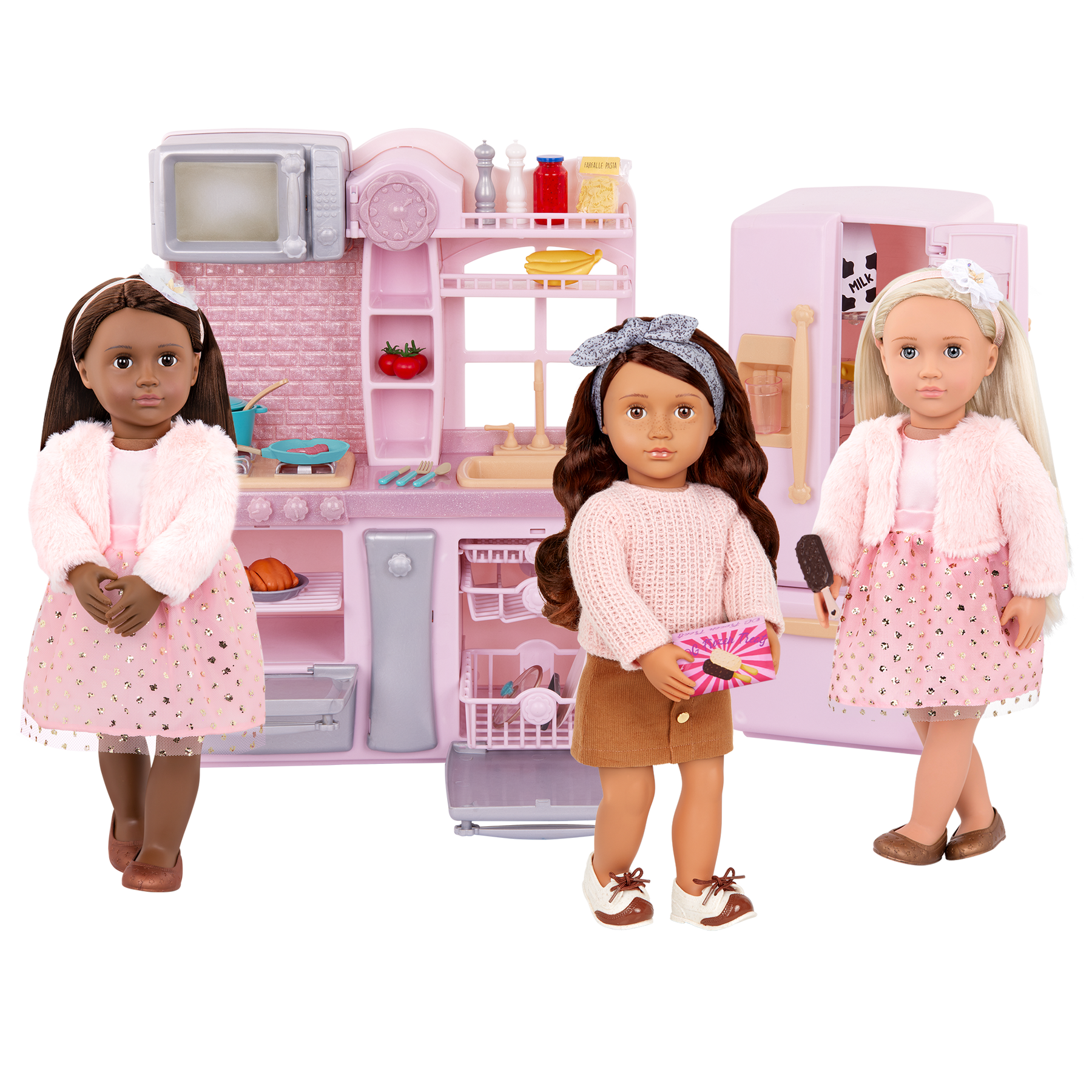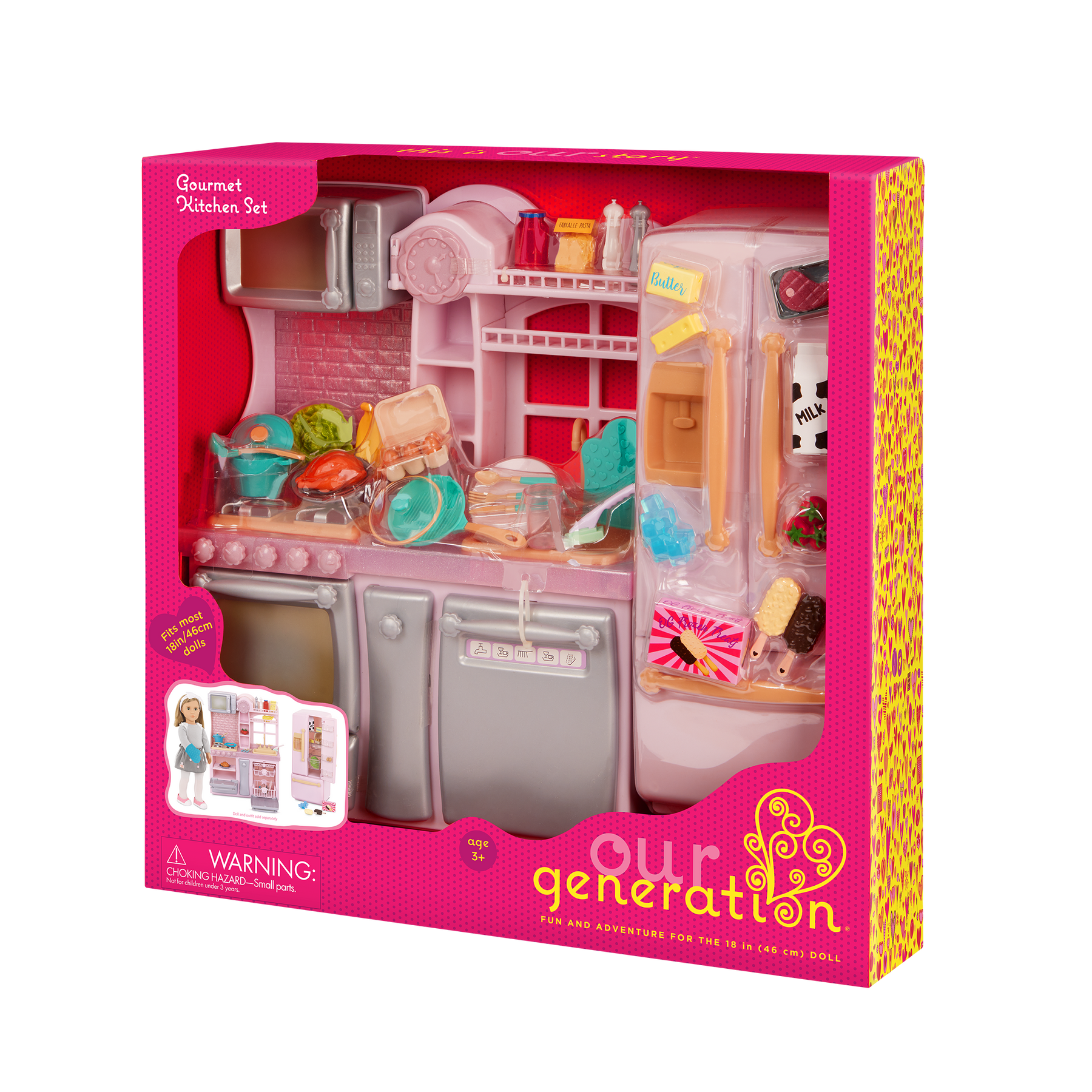 Your little chef will get inspired to cook their favorite foods with their 18-inch dolls in the Our Generation Gourmet Kitchen! This 53-piece pink kitchen playset includes a complete kitchen unit with an oven, dishwasher, and microwave. Plus, there's lots of counter space, cupboards, and shelving for your dolls to store all of the realistic accessories and play food! Where is the best place for the refrigerator? You can position it wherever you like! There are lots of interior shelves and a bottom-load freezer for keeping all of your doll's groceries fresh. Lifelike cooking items make playing kitchen even more fun. Our Generation accessories make a wonderful gift for kids ages 3+ (small parts), encouraging them to create their own unique stories. Compatible with most 18-inch dolls and accessories. Dolls sold separately.