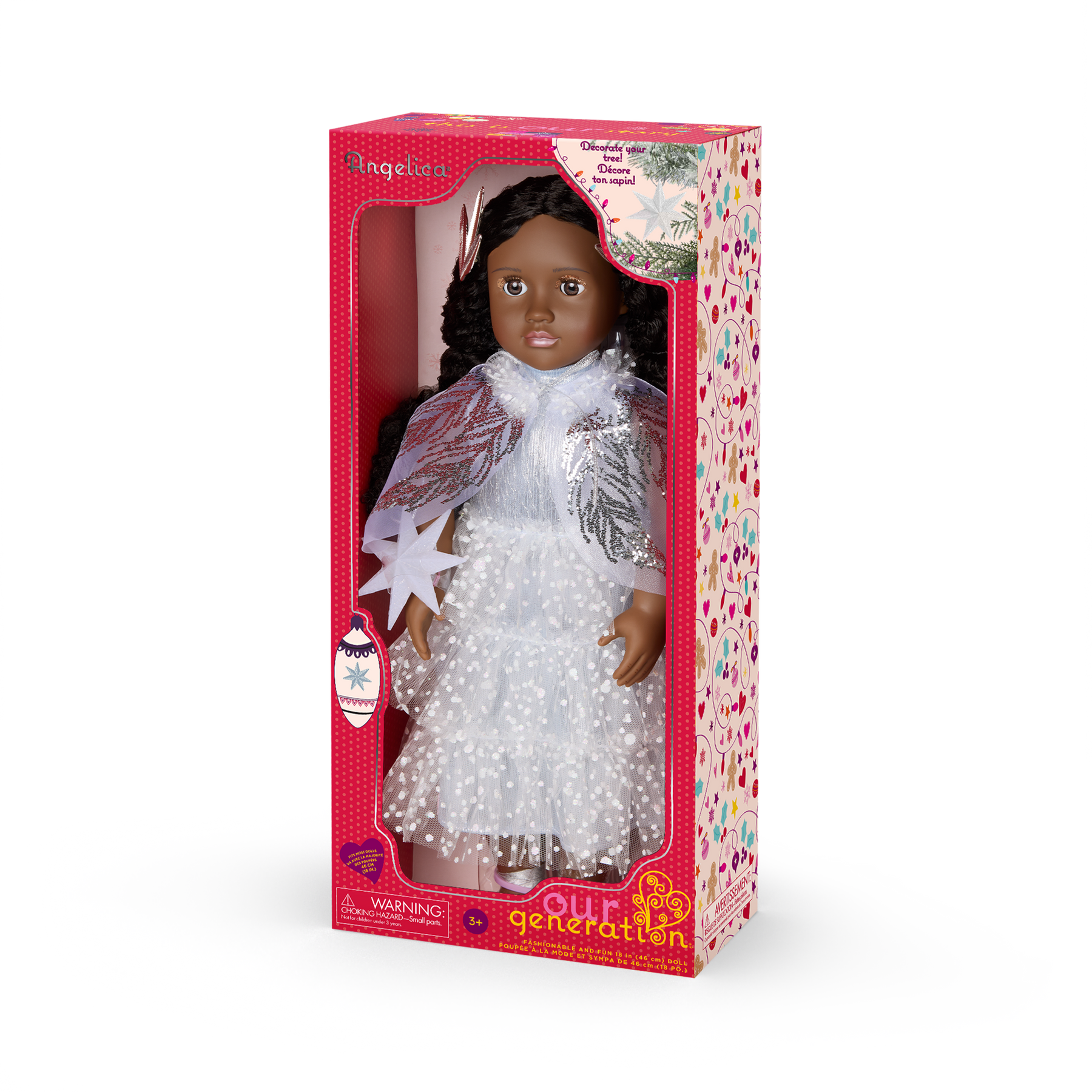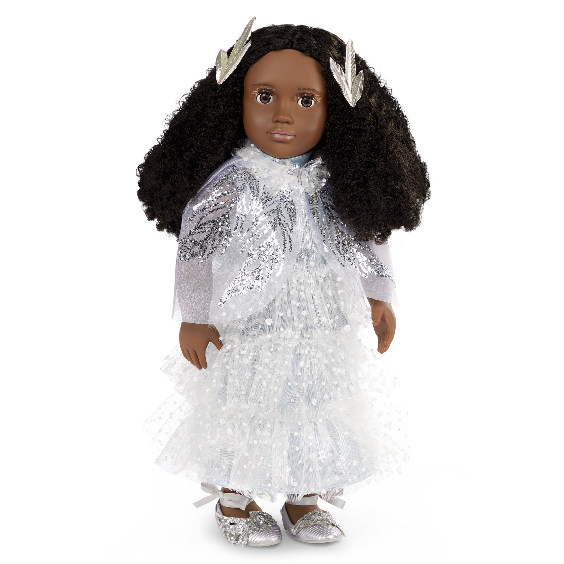 Our Generation limited-edition 46 cm doll Angelica sparkles with joy as she captures the most magical moments of the season. A vision of pure elegance, she shines in an icy-blue gown featuring shimmery layers of tulle and an organza capelet that drapes gracefully over her shoulders. Her long angelic curls are beautifully adorned with metal-winged hair clips, while glittery eye shadow and glossy accents elevate her celestial feel. She also holds a charming Christmas tree decoration depicting the traditional North Star, perfect for creating a festive display during holiday celebrations. Angelica has a huggable soft body, dark-brown hair to style, and lifelike dark-brown eyes that open and close. She arrives in special event packaging decorated with festive illustrations and includes a certificate of authenticity tucked inside. This Our Generation 2025 limited-edition holiday doll makes a wonderful gift for kids ages 3+ (small parts). Compatible with most 46 cm dolls, doll clothes, and doll accessories.