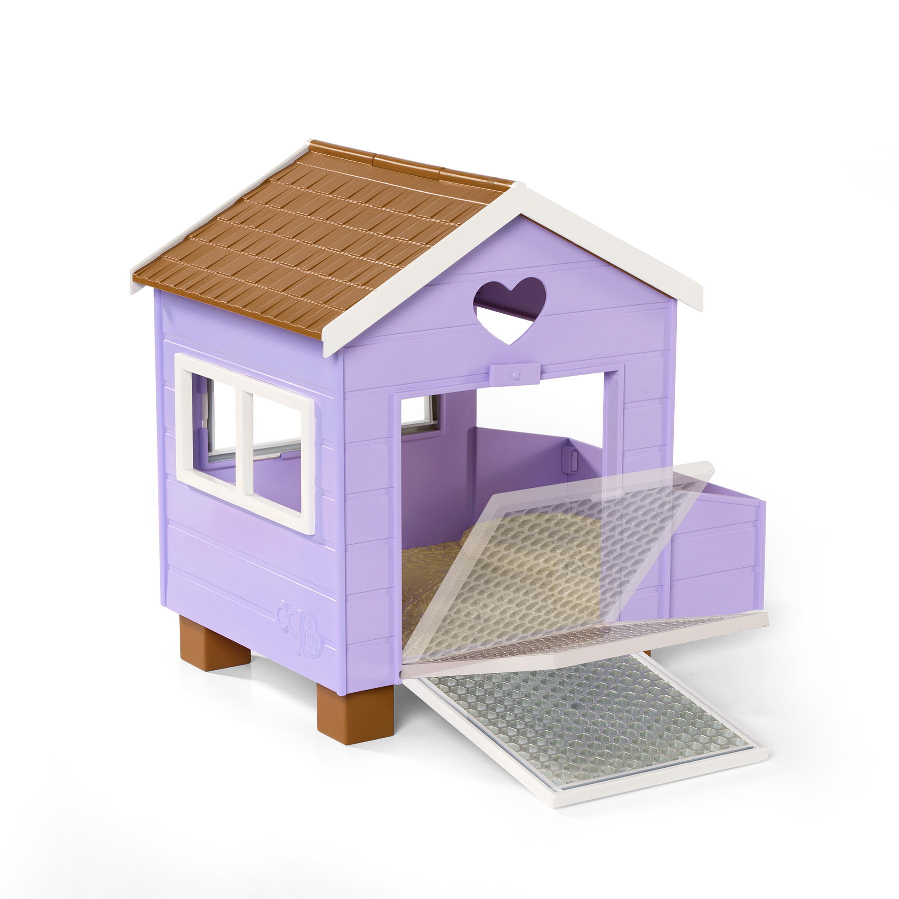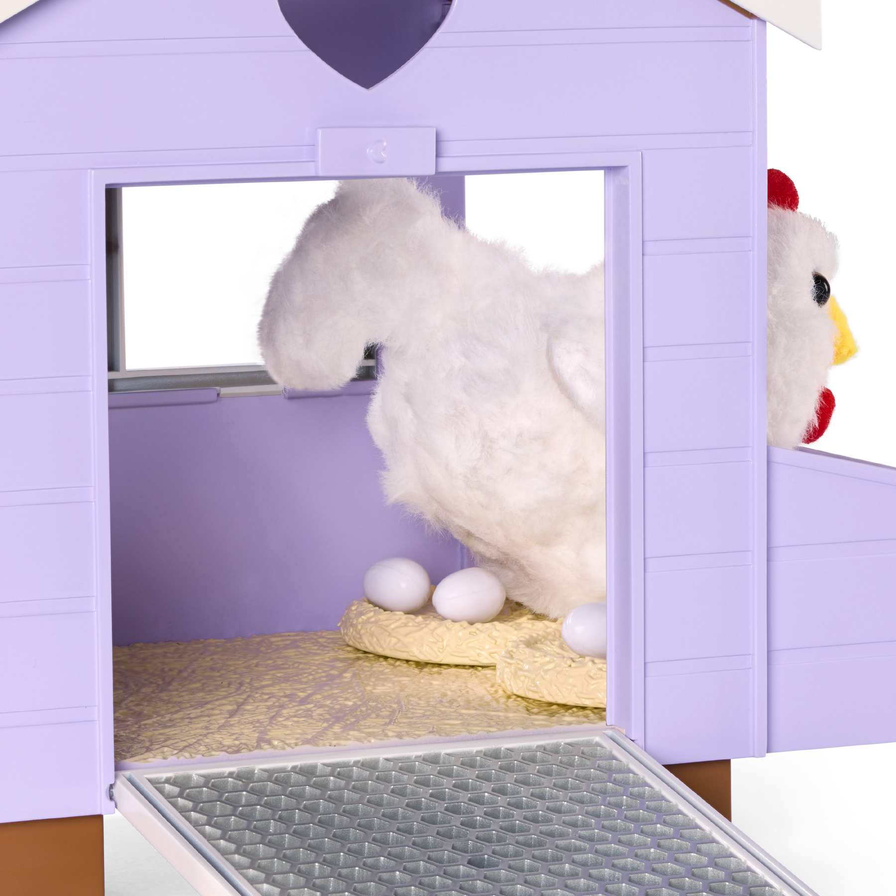 Rise and shine, it's farming time with the Our Generation Chicken Coop Playset for 18-inch dolls! This charming henhouse features functional details like an opening gable roof and a flip-down ramp for the animals to waddle in and out. Inside, kids will find a cozy hay-like design with nesting spots for each plushie. Plus, kids can help the chicken "lay" eggs by placing them inside the plushie as they play out the exciting role of a farmer! A feeder and scooper let young ones care for their feathery friends every day, while the carrying basket adds even more fun for collecting eggs and chicken feed clusters. Perfect for enhancing their doll collection, the Our Generation Chicken Coop Playset makes a great gift for kids ages 3 years old and up (small parts), encouraging imagination and nurturing a love for animals. Our Generation dolls sold separately.