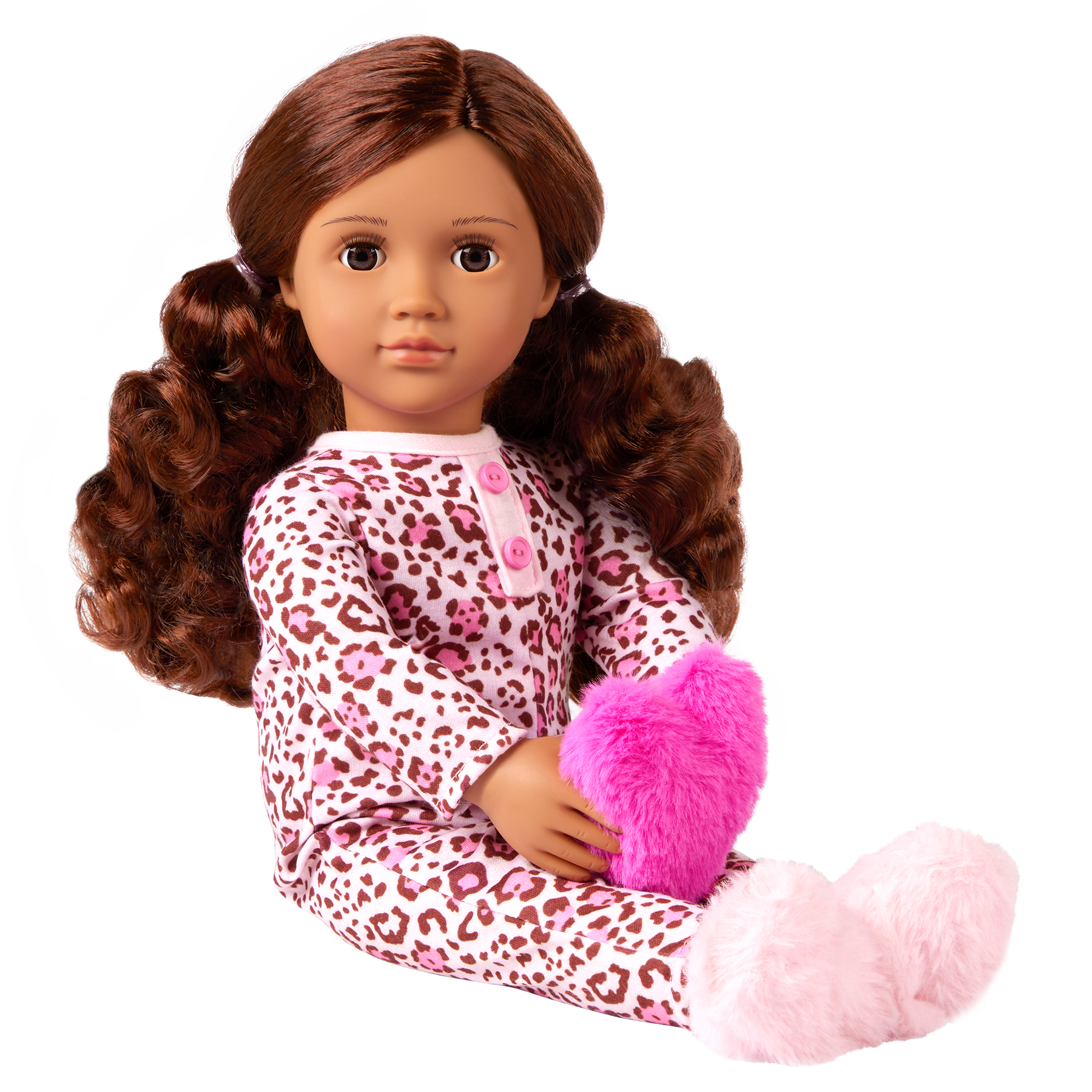 Sweet dreams await with Our Generation 46 cm doll Gracia! She wears a vibrant pajama with playful pink leopard spots. Plus, themed accessories like the heart-shaped plush pillow and fluffy slippers let kids role-play everything from bedtime routines to sweet slumber parties. Gracia has a soft, huggable body and lifelike details to delight doll fans during playtime. Her wavy auburn hair is fun to brush and style, and her dark-brown eyes really close as kids tuck her in to bed. An easy-change outfit inspires mixing and matching as fashion lovers dream up even more cute looks on any adventure. Our Generation dolls make a great gift for kids ages 3+ (small parts), encouraging them to imagine their own unique stories.
