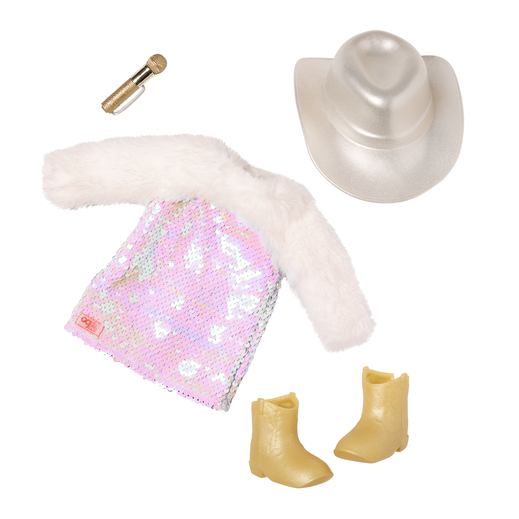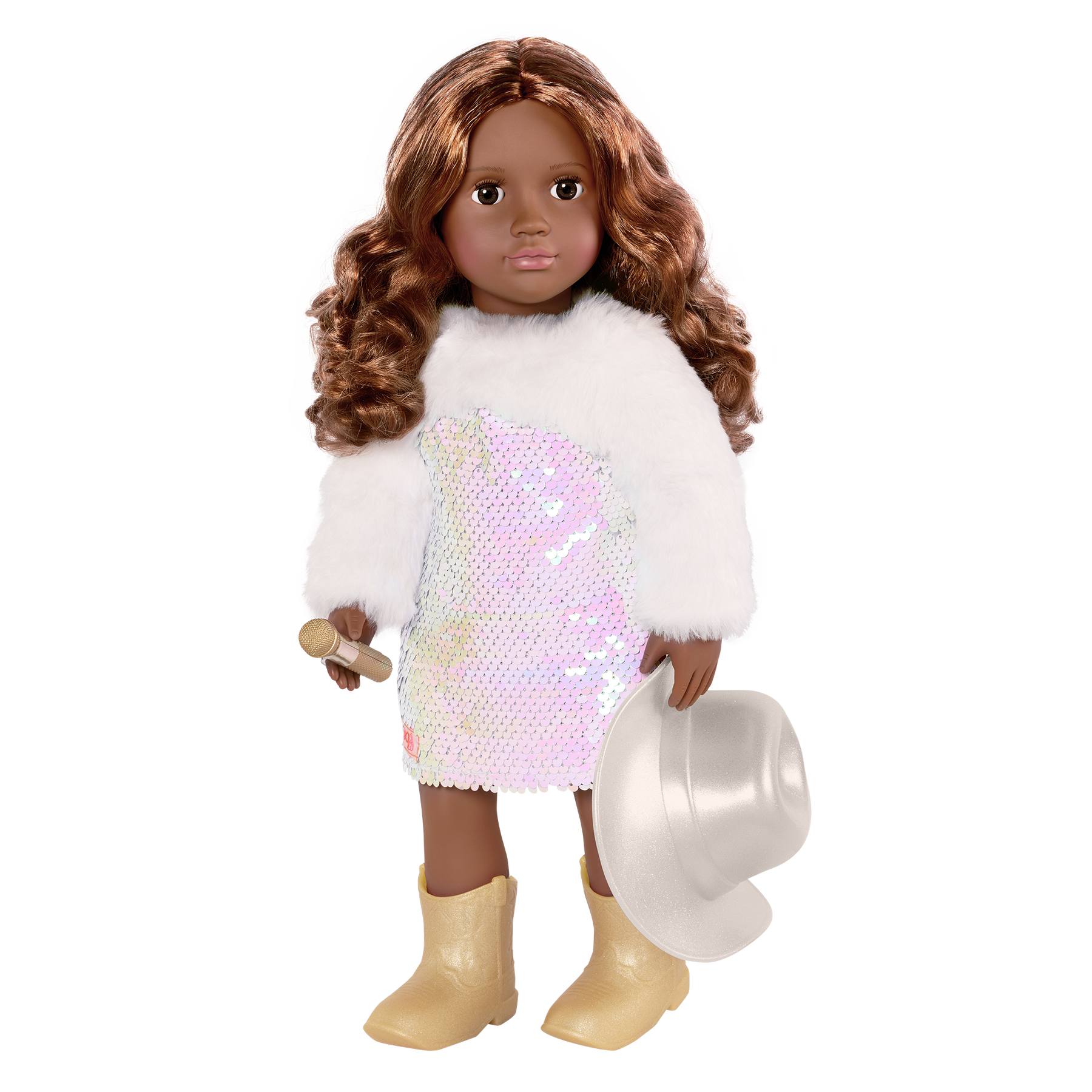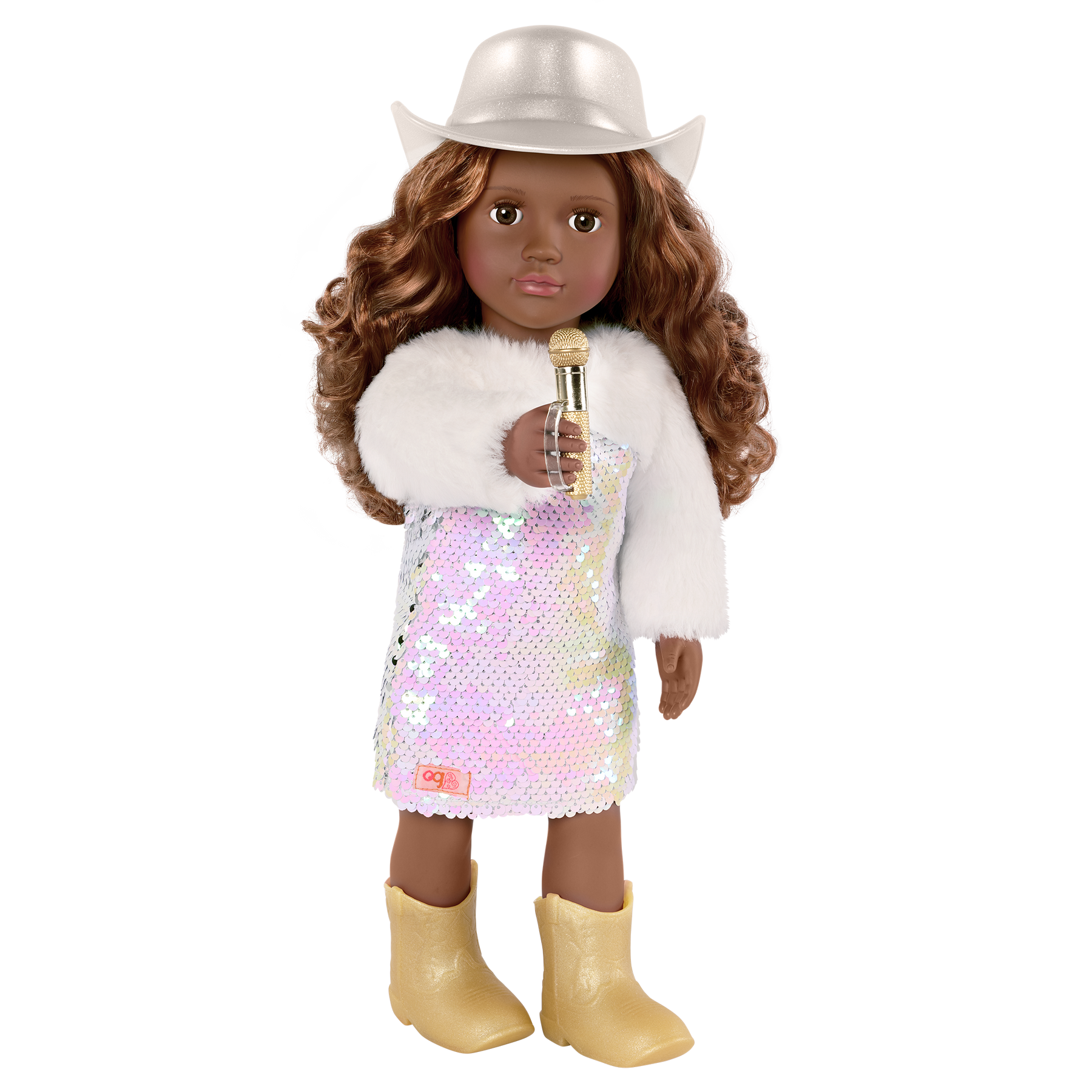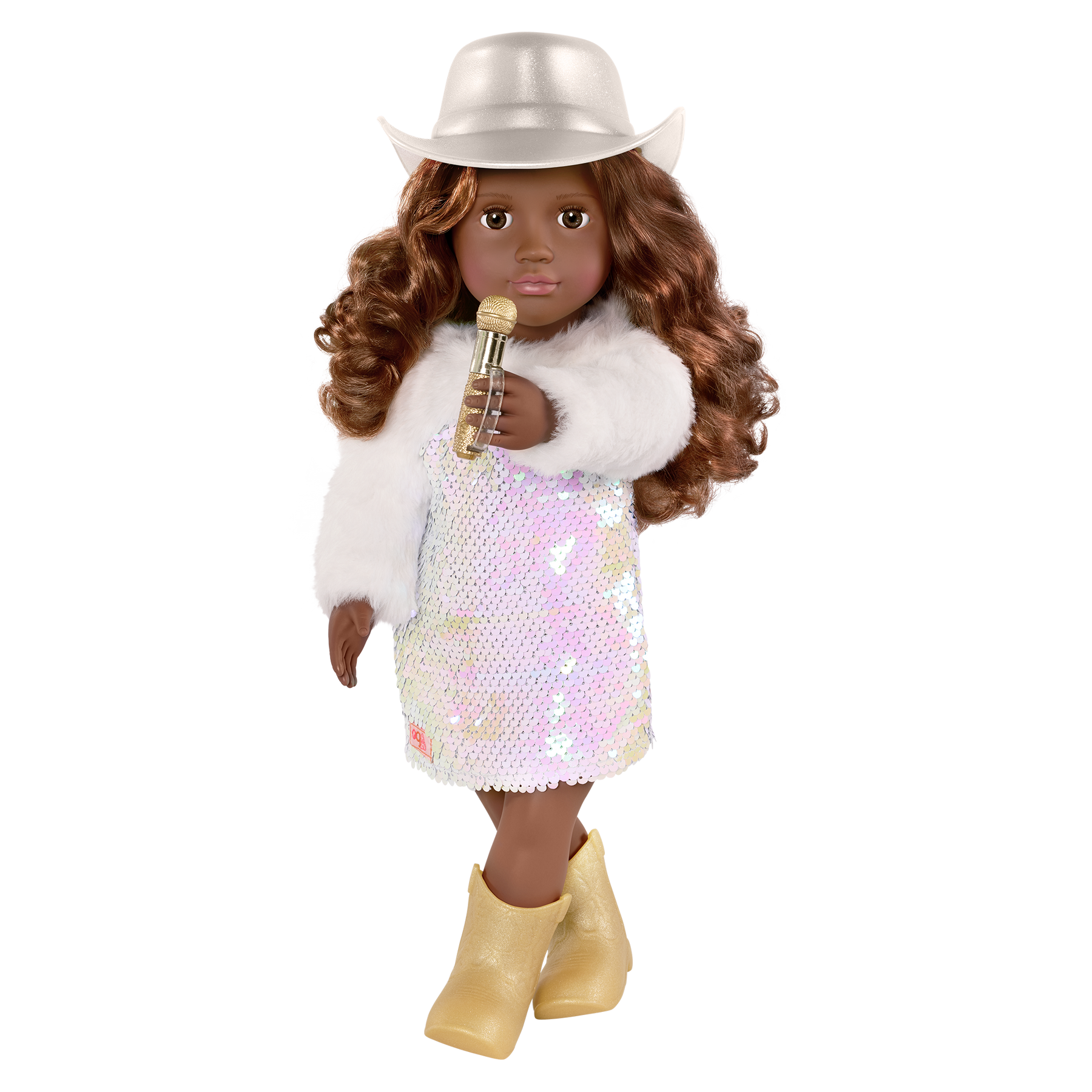 Sing, dance, and shine your brightest with Our Generation 46 cm doll Harmony! This aspiring country star has a passion for performing. She carries her microphone everywhere, designed with a loop to hold as she puts on a show around the world. Plus, the easy-change outfit lets kids explore fun costume changes along the way! Harmony wears a shimmery flip-sequin dress with faux-fur details, a cute cowboy hat, and tall boots. She has a huggable soft body and lifelike features to delight doll fans during playtime, from her expressive brown eyes that open and close to her stylable dark-brown hair. What will Harmony’s musical adventure look like? The story is up to you! Our Generation dolls make a great gift for kids ages 3+ (small parts). Compatible with most 46 cm dolls, doll clothes, and doll accessories.