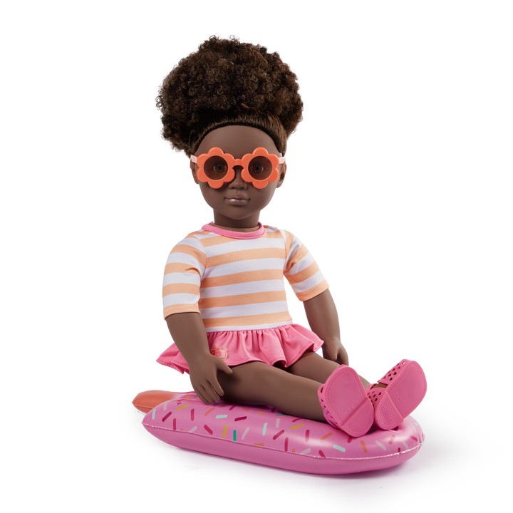 Explore beach day waves and vacay adventures with Our Generation 18-inch doll Nadya! Dressed for fun in the sun, she wears a striped swimsuit with a pink frilly waist, peep-toe sandals with mini heart cutouts, and floral sunglasses that add a splash of cuteness. Plus, Nadya comes with a pink popsicle-themed pool float that inspires pretend swimming and sweet storytelling. It features a rainbow sprinkle print and even inflates like a real floatie! Nadya has lifelike details that will delight doll fans during playtime, from her adorable freckles and curly brown hair to her beautiful brown eyes that open and close. And for kids who love dress-up, her outfit has easy-open closures to quickly put on and remove. So they can mix, match, and create more fun looks. Our Generation dolls make a great gift for kids ages 3+ (small parts), encouraging them to imagine their own unique stories.