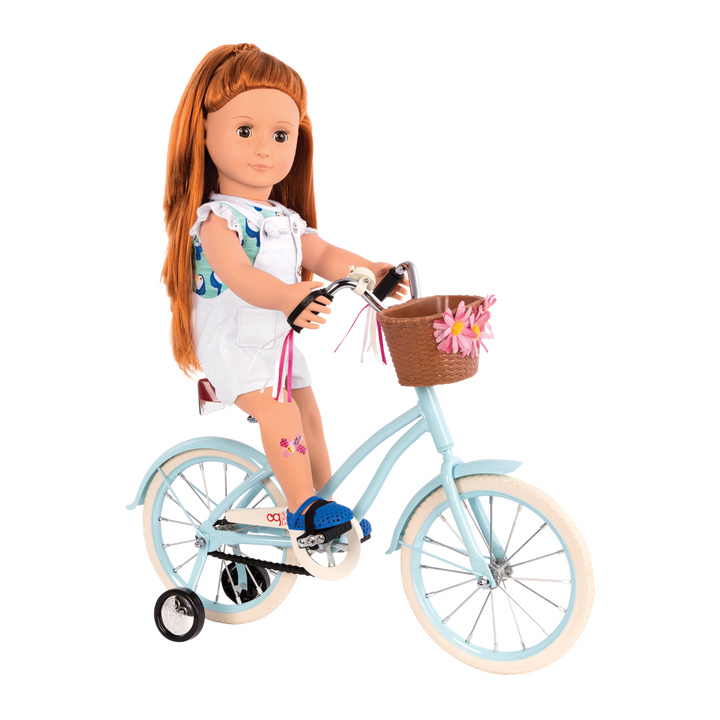 Take your dolls for a spin around the block with the Our Generation Anywhere You Cruise Doll Bicycle! This miniature bicycle for 18-inch dolls is the perfect vehicle for a fun summer day exploring the neighborhood. The Anywhere You Cruise bicycle is a lovely pale-blue shade and comes with a woven front basket to hold your doll's things as she rides. The handlebar streamers and imitation bell give it an extra-realistic look, and the pedals and wheels really work. Straps help keep your doll's feet on the pedals, and the training wheels will keep it steady as your dolls learn how to ride! (Dolls and outfits sold separately)