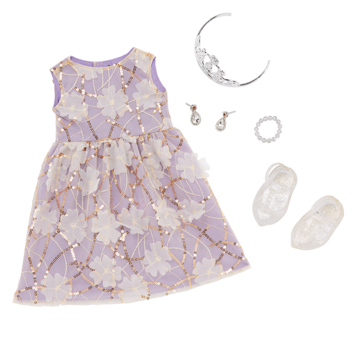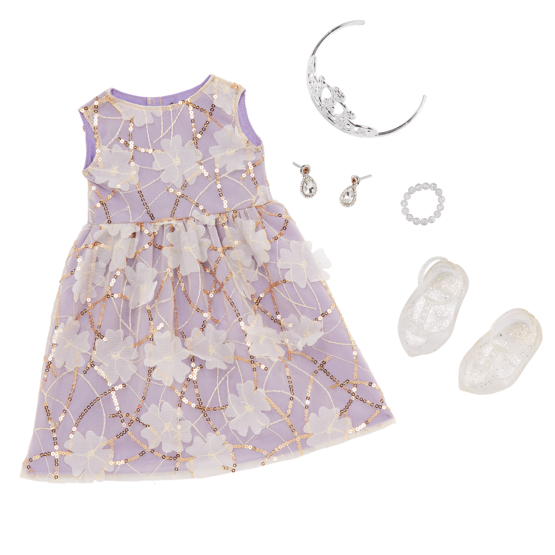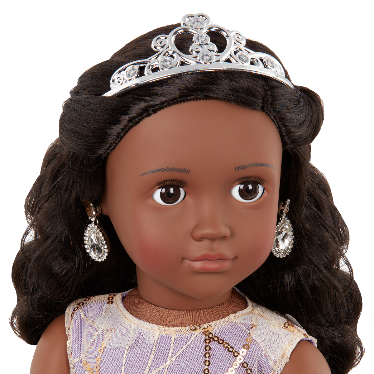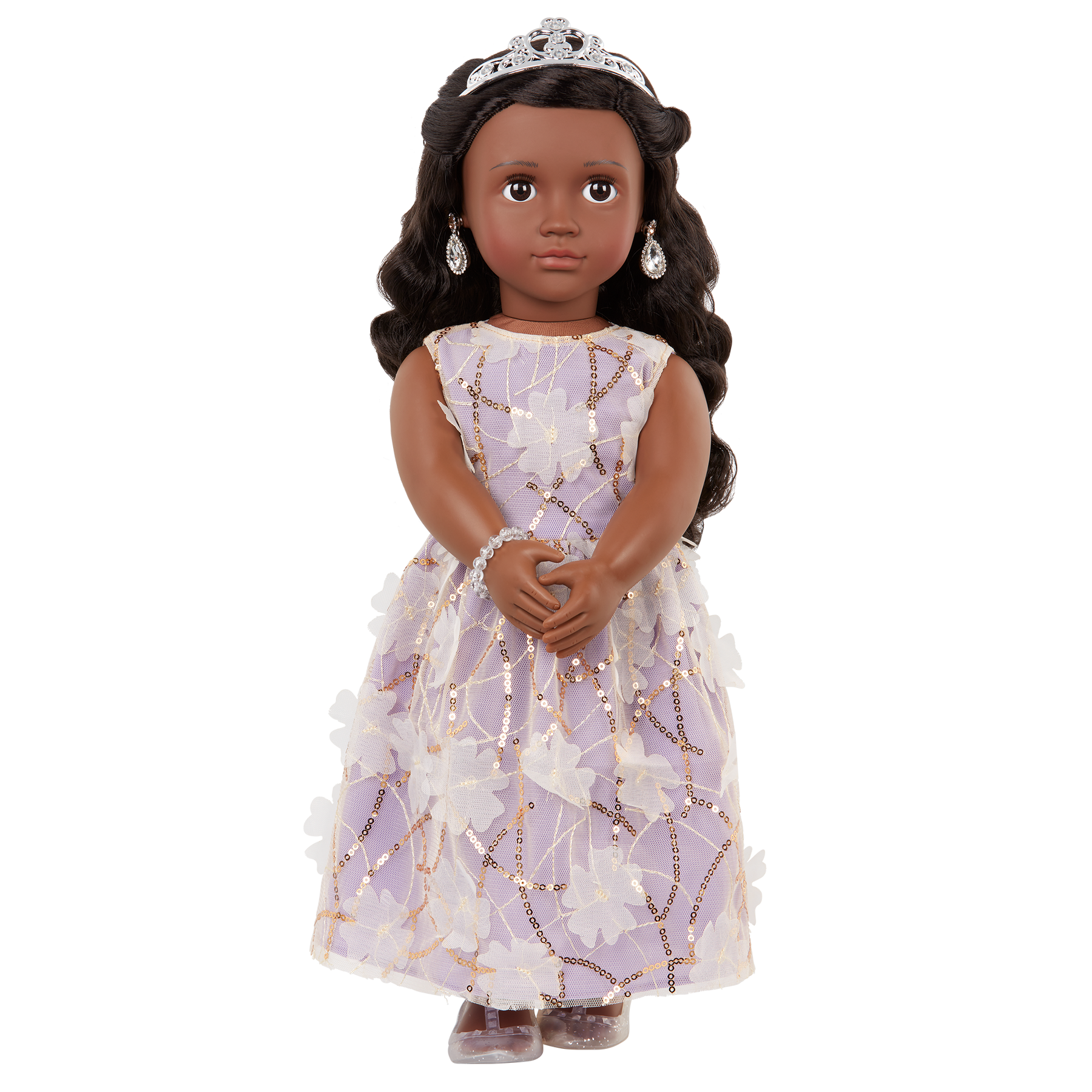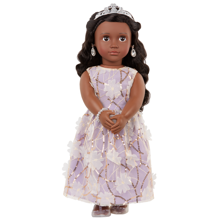 Celebrate special events and shine bright with Ambreal! This Our Generation 18-inch doll has beautiful brown eyes that open and close with long, brushable brunette hair that's fun to style. Give Ambreal pretty ponytails, braids, updos, and more fun hairstyles before accessorizing with her tiara. Then help her sparkle with her jewelry collection, including a beaded bracelet and a pair of super cute earrings - she has pierced ears! Ambreal has a cuddly soft body and can rotate her neck, arms, and legs to easily change outfits. She arrives wearing a lovely floral gown decorated with golden sequins and a pair of shimmering shoes. Ambreal's gown also features easy-open closures to quickly put on and remove, so you can dress her in more fun Our Generation styles to prep for any adventure!