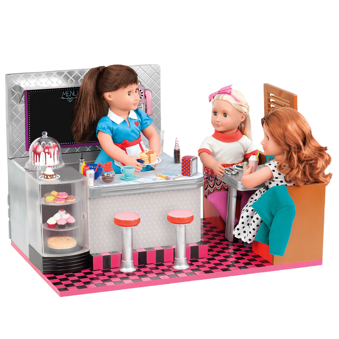 • 75-piece Retro Diner Restaurant Playset: your 18-inch dolls will get their fill of sweet retro fun at the award-winning Our Generation Bite to Eat Diner!