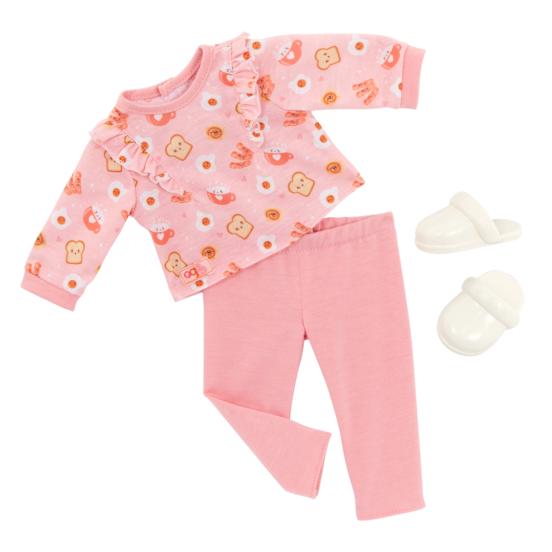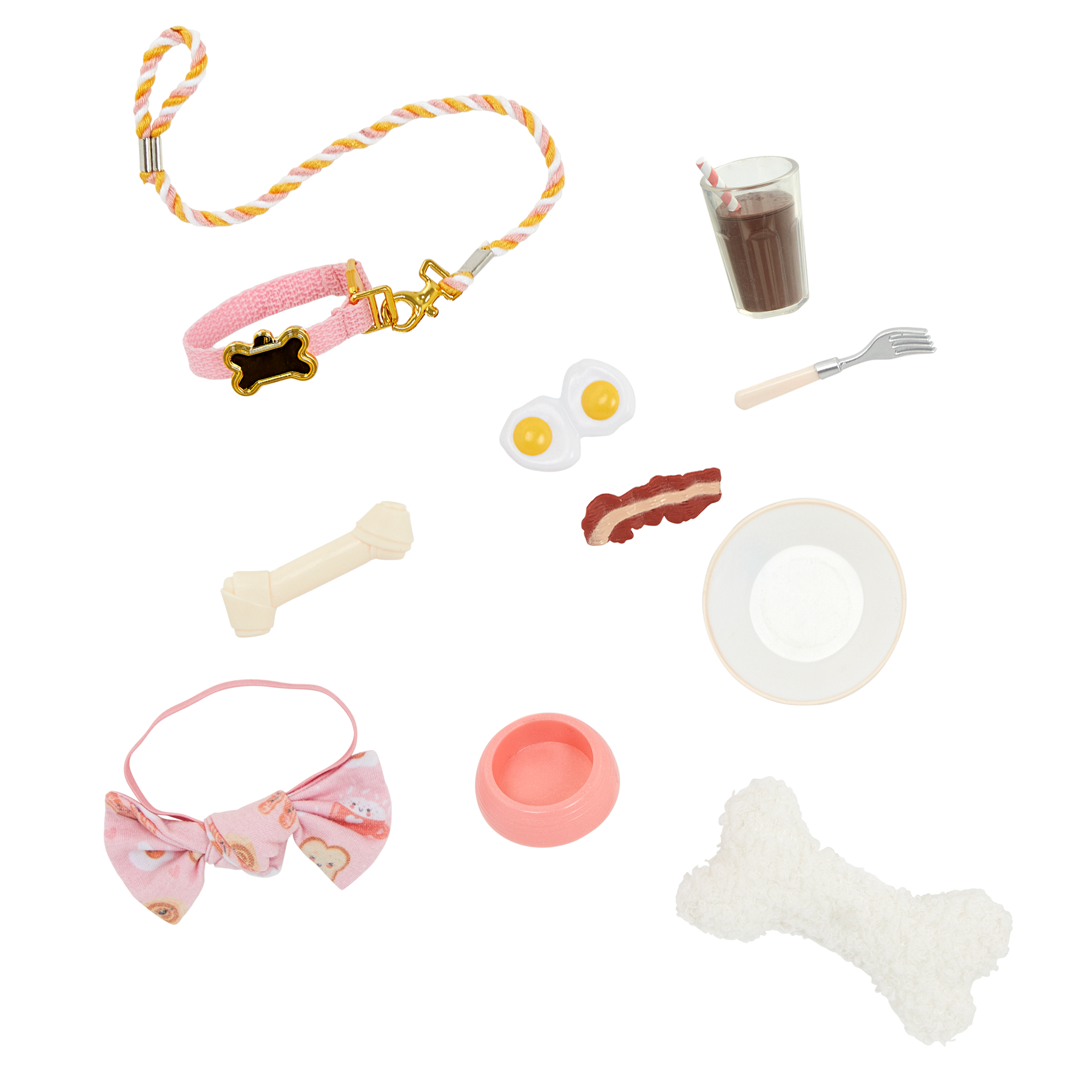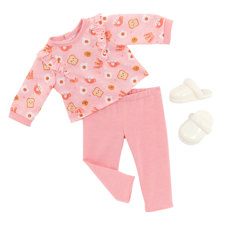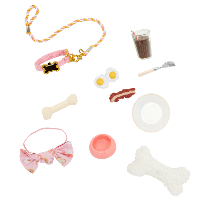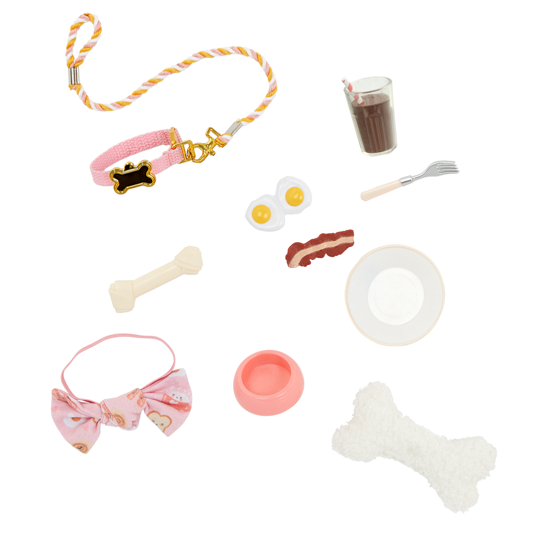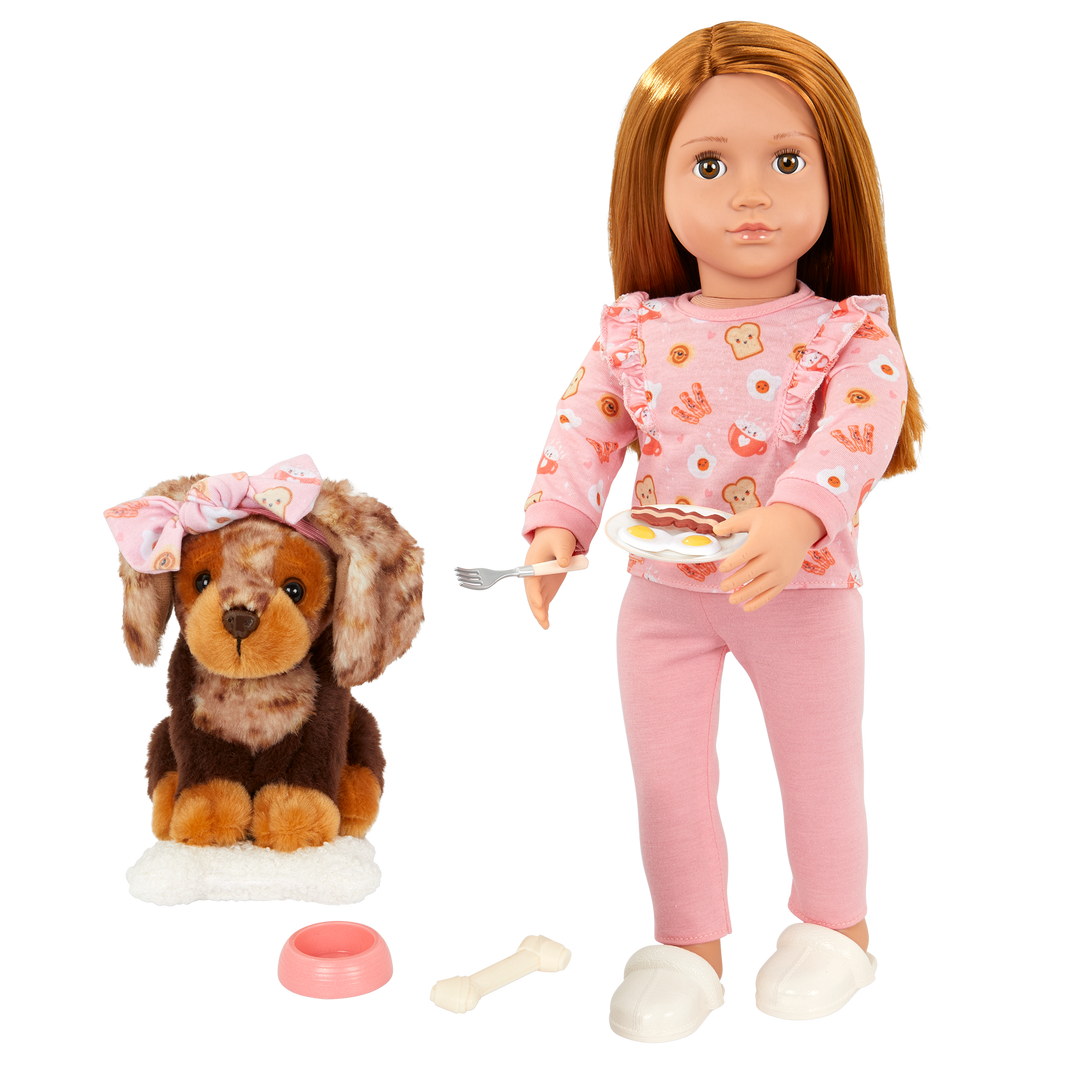 • Includes: doll, a food-print pajama top, pajama bottoms, a pair of undies, slippers, 6-inch Dachshund dog plush, removable collar and hair bow, attachable leash, pillow, chocolate milk, fork, food bowl, plate, eggs, a slice of bacon, and toy bone.