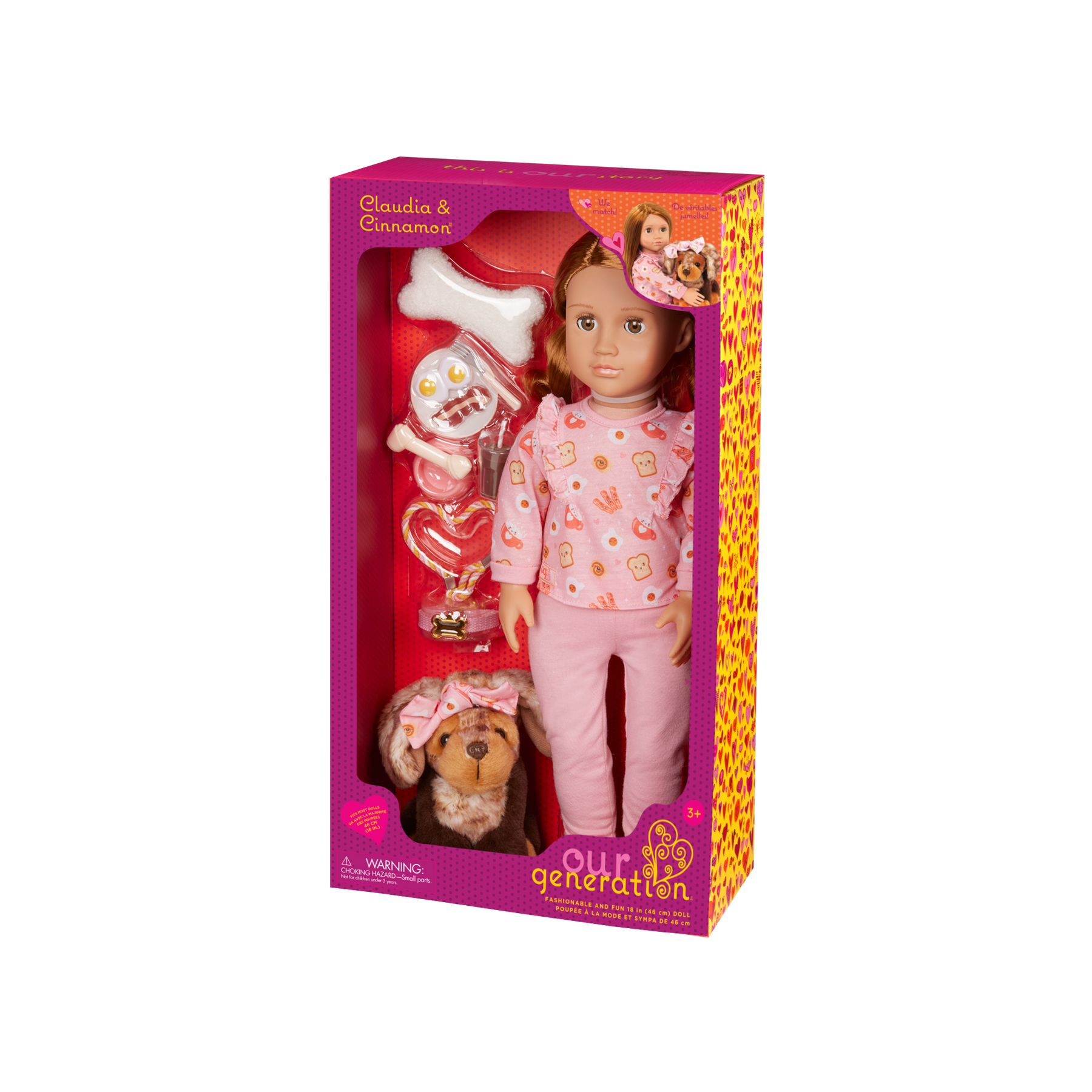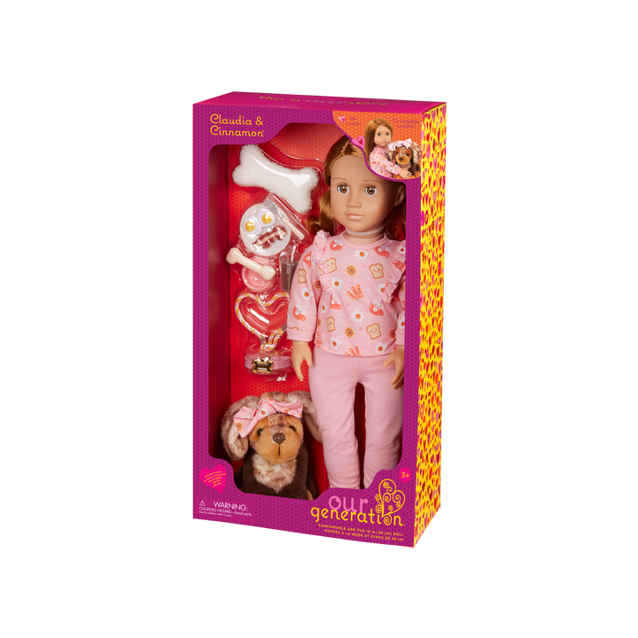 • 18-inch Doll & Pet Set: from breakfast to bedtime, Our Generation 18-inch doll Claudia and her pup Cinnamon love matching in fun fashion!