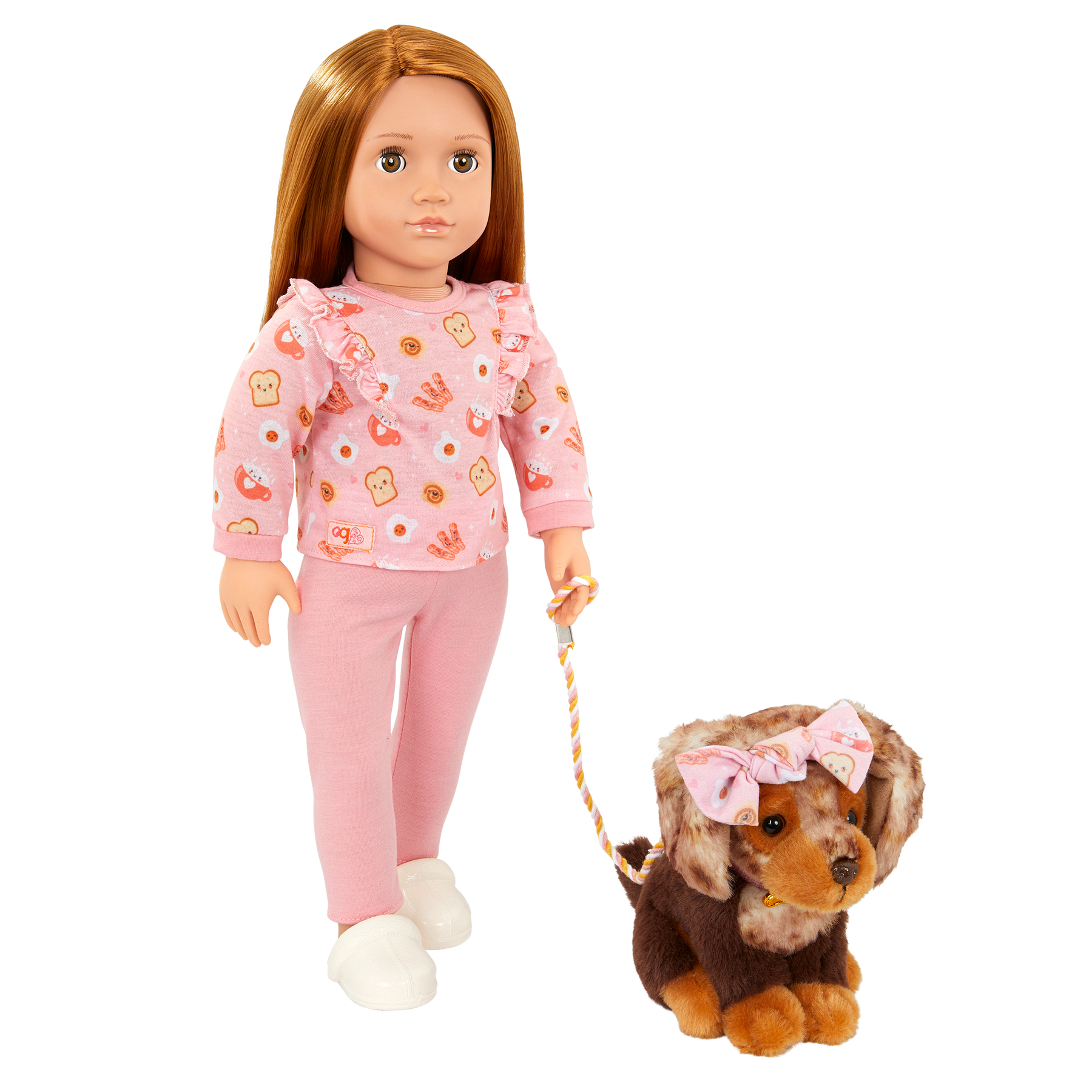 From breakfast to bedtime, Our Generation 18-inch doll Claudia and her pup Cinnamon love matching in fun fashion! Claudia has a huggable soft body and lifelike features, from her beautiful hazel eyes that open and close to her long red hair to style. Keep Cinnamon comfy with the pillow as you prep a delicious breakfast. This set includes play food accessories like eggs, a slice of bacon, a plate, chocolate milk, a fork, a toy bone, and a food bowl. And the leash attaches to Cinnamon's collar when it's time to go out and about! Claudia's playful pup is a 6-inch Dachshund breed. It has soft plush fur and a stylish hair bow that matches Claudia's outfit! Claudia arrives wearing a cute pajama outfit with a food-print top and slippers. Her outfit also has easy-open closures to quickly put on and remove, so you can mix, match, and create more fun looks every day!