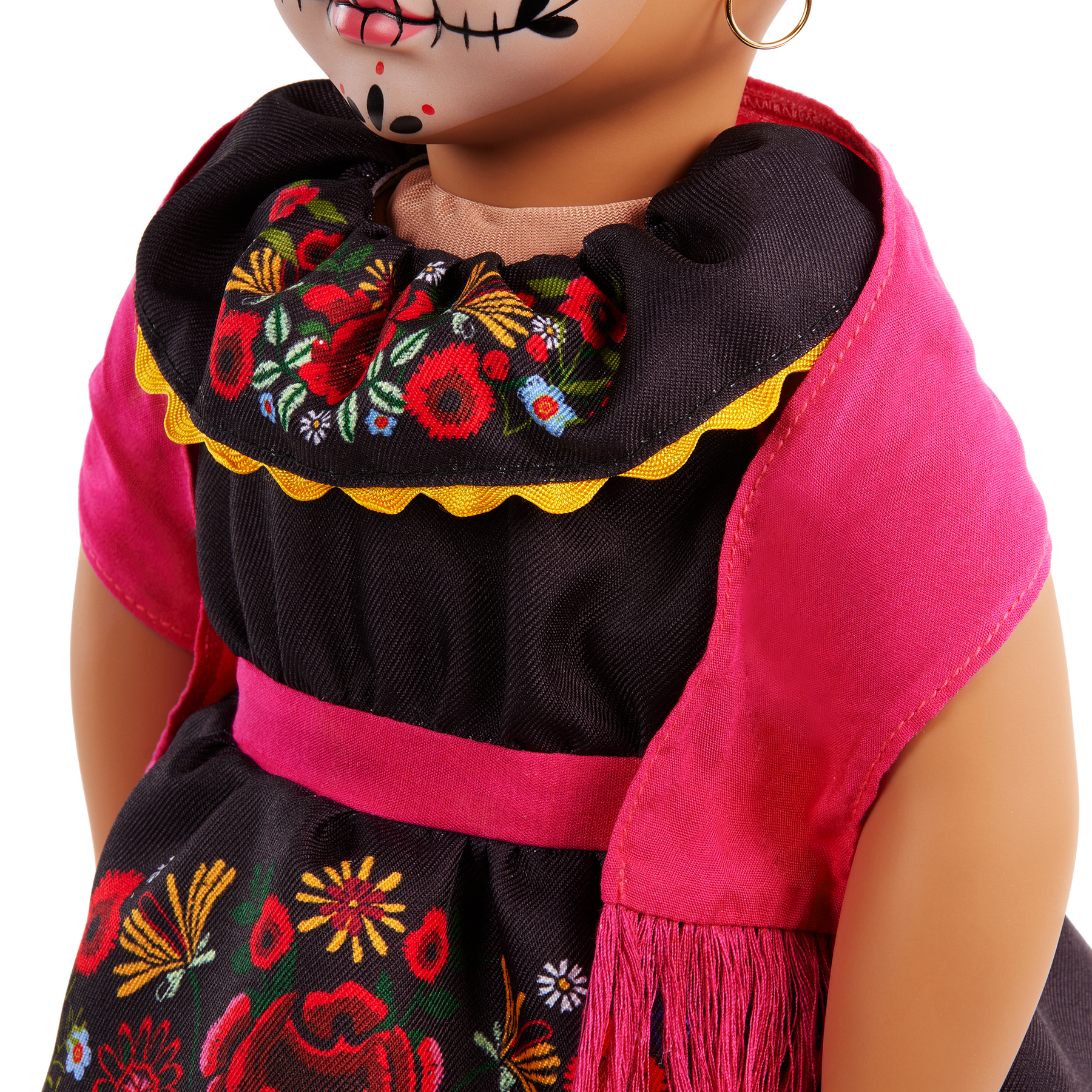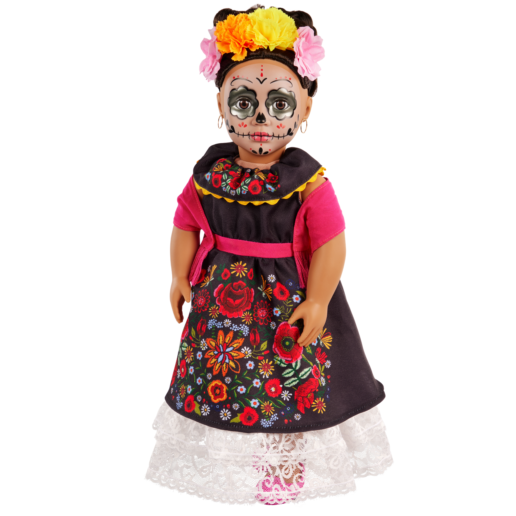 Our Generation 18-inch doll Esperanza embraces the beautiful traditions of Día de los Muertos and encourages kids to learn about cultural identity in a fun and engaging way. Known as Day of the Dead, this holiday originated in Mexico and honors loved ones through music, food, and rituals. Esperanza pays tribute to her Mexican heritage with striking yet playful "calavera" (skull) face paint inspired by La Catrina - an iconic symbol in Mexican culture that reminds us how Día de los Muertos is a time to honor family, life, and happy memories. Plus, her vibrant flower crown and Tehuana-inspired dress are adorned with signature flowers like "cempasuchil" (marigolds) and "clavel" (carnations). These flowers are also used to decorate altars in homes called ofrendas, which provide a sense of connection to past generations, while the Tehuana dresses (worn by the women in Oaxaca, Mexico) display strength, beauty, and cultural pride. Esperanza has a huggable soft body, pierced ears with removable hoop earrings, wavy brown hair, and lifelike dark-brown eyes that open and close. She comes in special edition packaging with illustrations of sugar skulls and florals seen throughout the festivities. Clothing has easy-open closures to quickly put on and remove as kids explore storytelling and self-expression. Compatible with most 18-inch dolls, doll clothes, and accessories. This Our Generation Día de los Muertos doll makes a wonderful gift for kids ages 3+ (small parts).