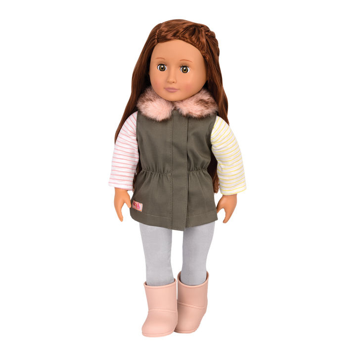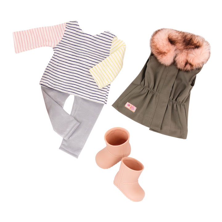 Keep your 18-inch dolls cozy and fabulous with the Our Generation Fun Fur Fall outfit! This cool-weather look is perfect for back-to-school or for any occasion. Start with the comfy and soft long-sleeved top, striped in 3 different colors. Then add the gray leggings for a cozy layer underneath, and top it all off with the super cute parka vest! The pale pink boots are the finishing touch to keep your doll's toes warm on all her great autumn walks! This outfit is compatible with most 18-inch dolls and doll clothes. Dolls sold separately.