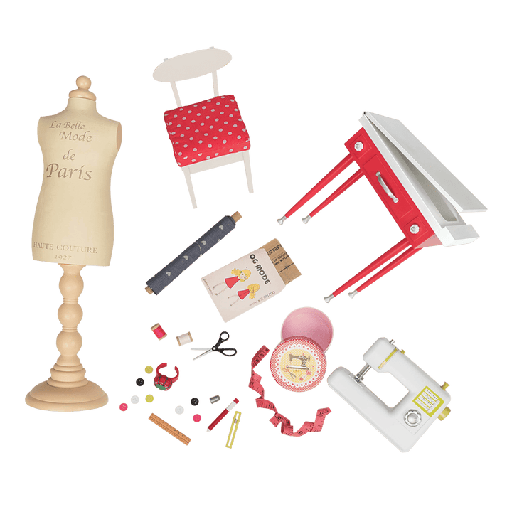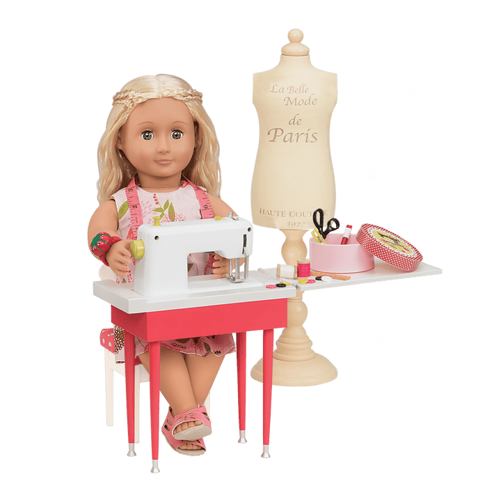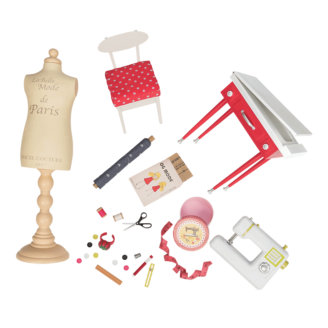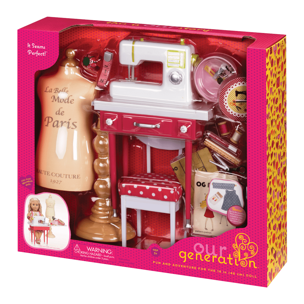 Everything a fashionista needs to make anything happen. Get ready for your fashion designs to hit the runway with the Our Generation It Seams Perfect Sewing Set, a 20-piece sewing accessory set for 18-inch dolls! Your favorite dolls can set up their very own sewing room and let their fashion design inspiration take over with this great sewing set! Set up the sewing machine on the cute red sewing table with matching chair to get your seamstress started. Use the Parisian dress form to plan out your couture creations. Use the charming box to hold your sewing notions like a measuring tape, pin cushion, ruler, thread, scissors, and more. Can't wait to get started designing? This set includes a roll of real fabric! Use the included pattern to make a dress for your dolls, or use your imagination and sew something of your very own! (Dolls sold separately)
