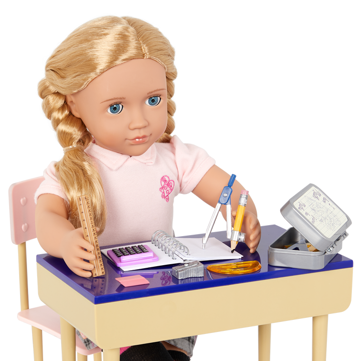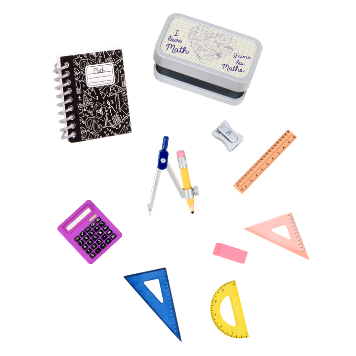 Build up your doll's math skills with the Our Generation Math Whiz accessory set! Perfect for any math and school lover, it features a complete geometry set that will help your besties ace their next pop quiz! Use the calculator to help with division, and grab the protractor to figure out the angle of the triangle you drew in art class! There's even a spiral notebook and pencil to work out the most challenging math problems the teacher writes on the board! Anything is possible with this math accessory set and Our Generation! (Dolls sold separately; triangle rulers and protractor colors may vary)