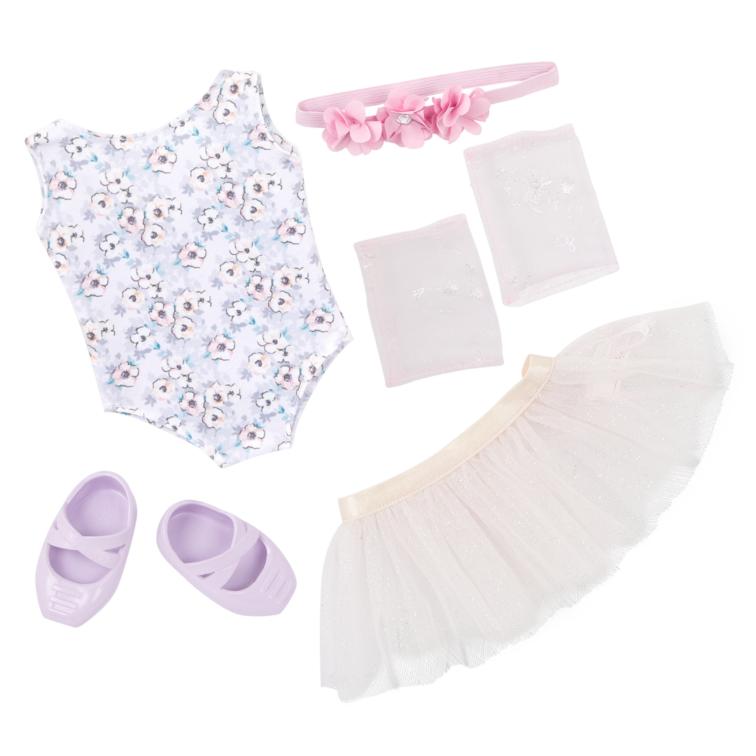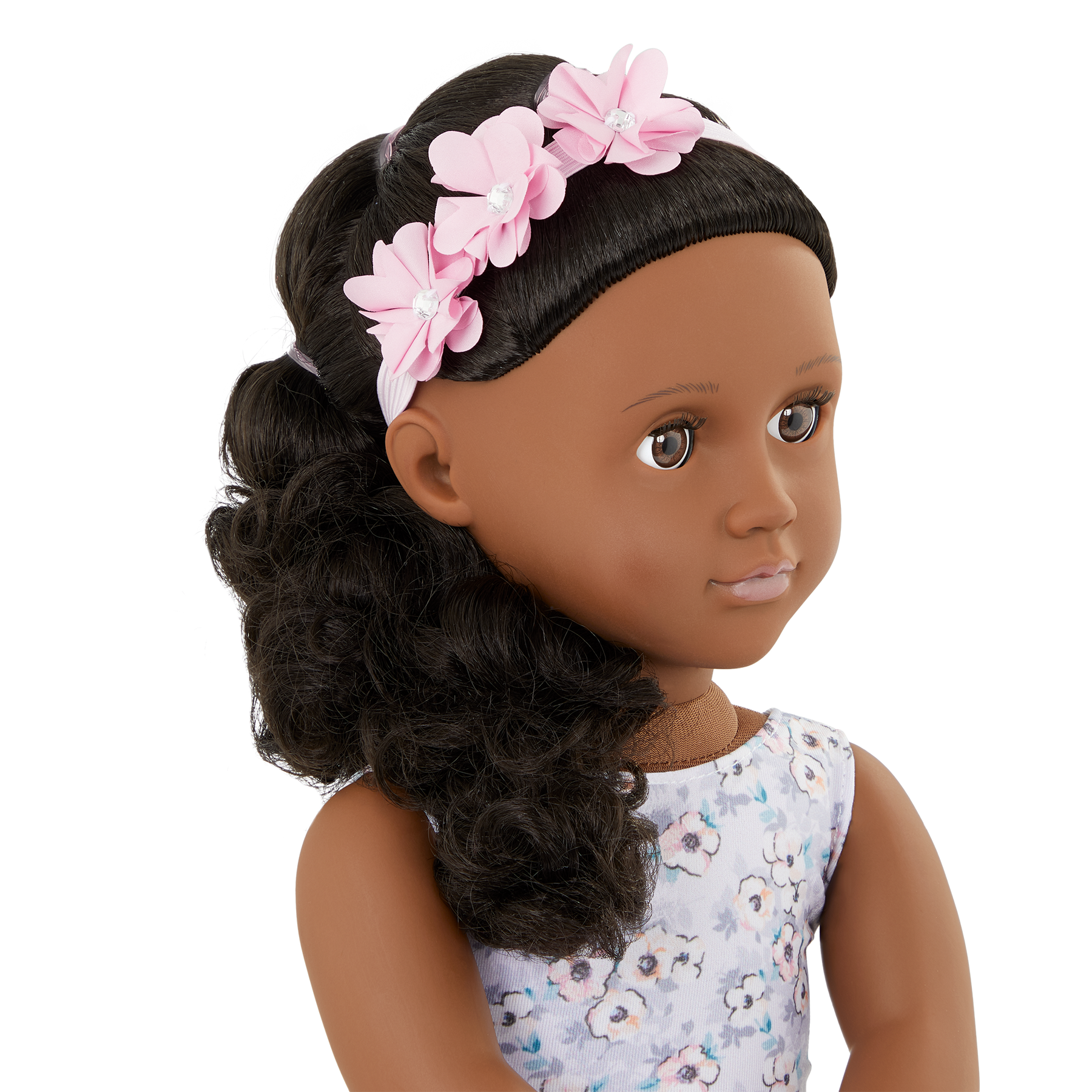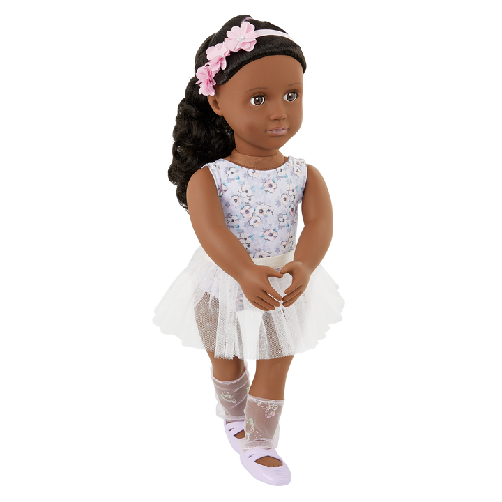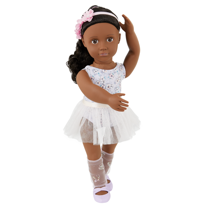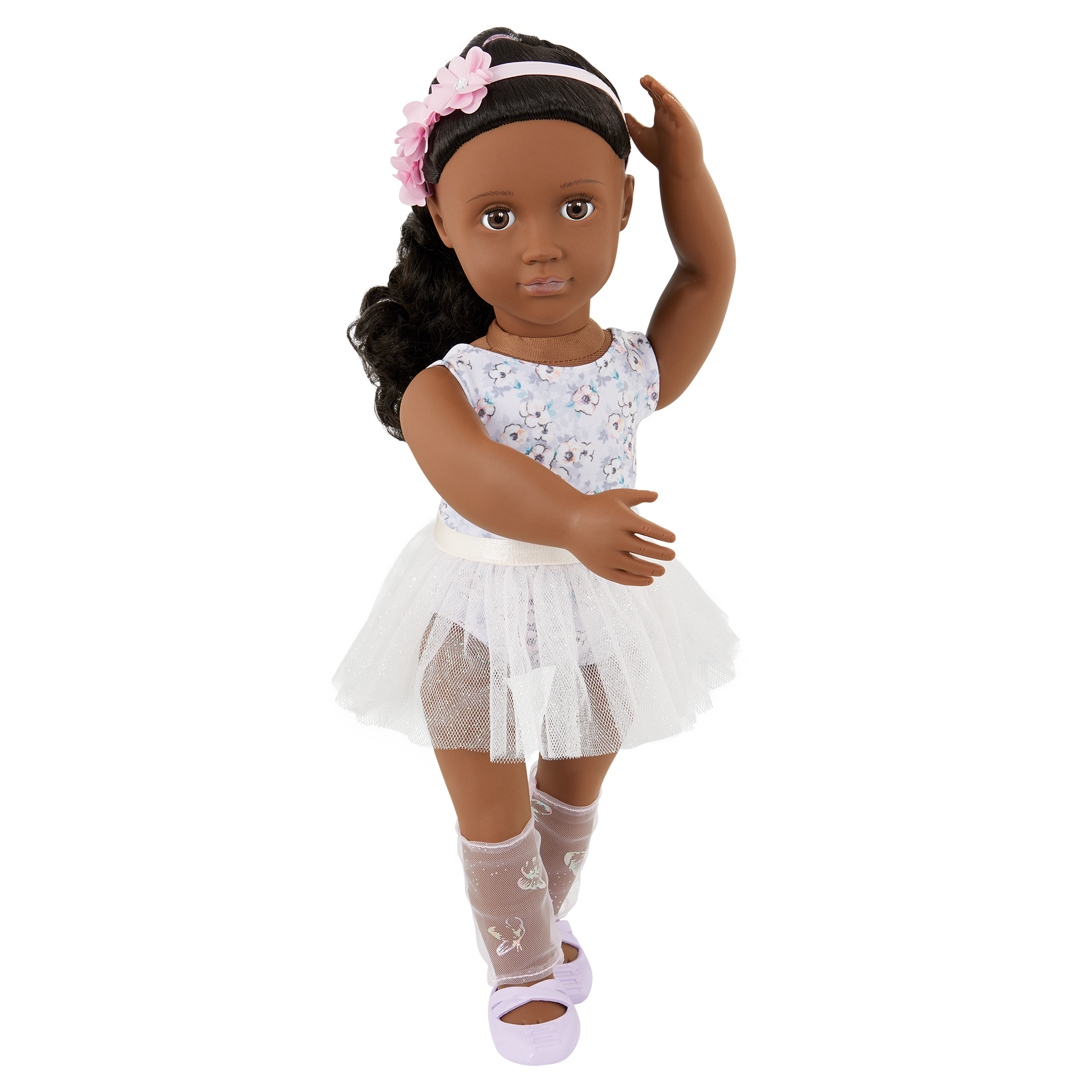 Dance, shine, and put on a show with Our Generation 18-inch ballerina doll Mysa! She has a huggable soft body and lifelike features, from her beautiful brown eyes that open and close to her long black hair that's fun to style before every recital. She arrives wearing an awe-inspiring ballet outfit that includes a floral leotard with a lace tutu, a pair of leg warmers, and a floral headband for an extra chic touch. When it's time for dress-up, her outfit has easy-open closures to quickly put on and remove, so you can mix, match, and give Mysa more fun looks for any adventure you discover together!