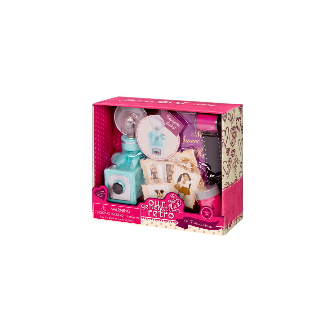 This retro Our Generation Old Fashioned Photos accessory set will bring some vintage charm to your 18-inch dolls’ collection. Take photos of you and your friends then put them in the scrap book so you can treasure the memories for years to come. Includes a retro camera with a realistic light and sound to capture fun moments with your doll besties, a roll of film, film case, photo album, and 5 photos. Compatible with most 18-inch dolls and accessories. (Dolls sold separately)