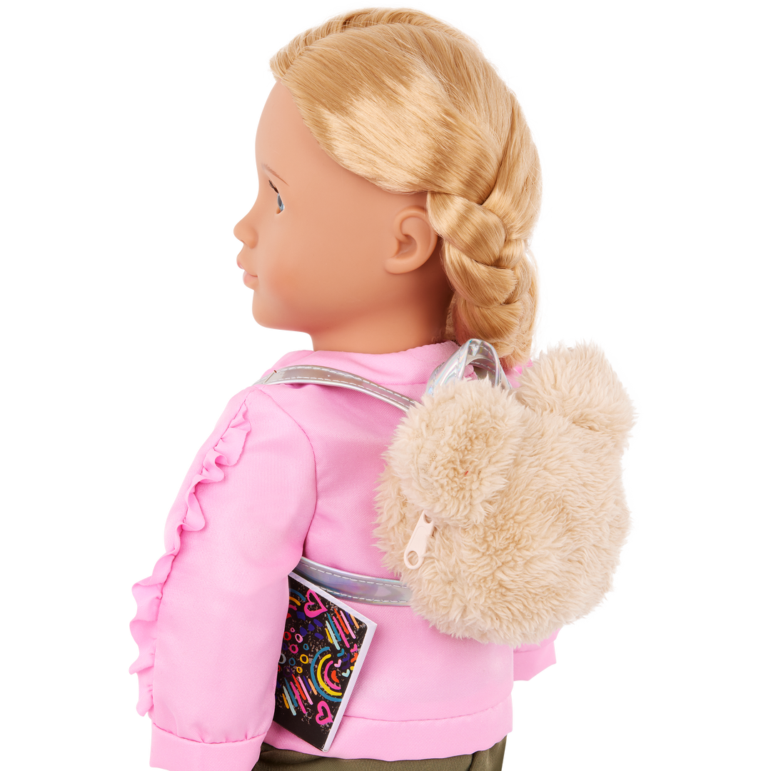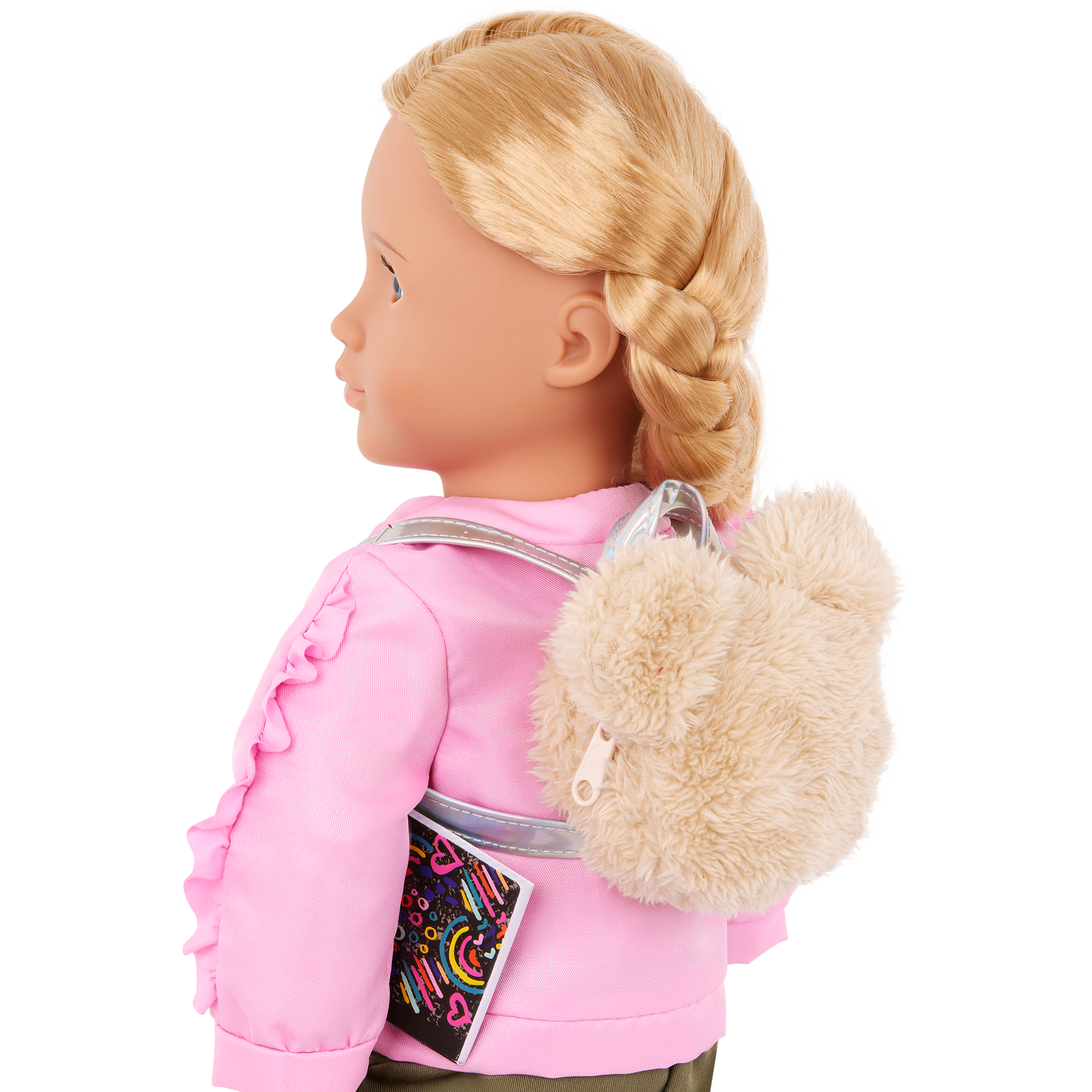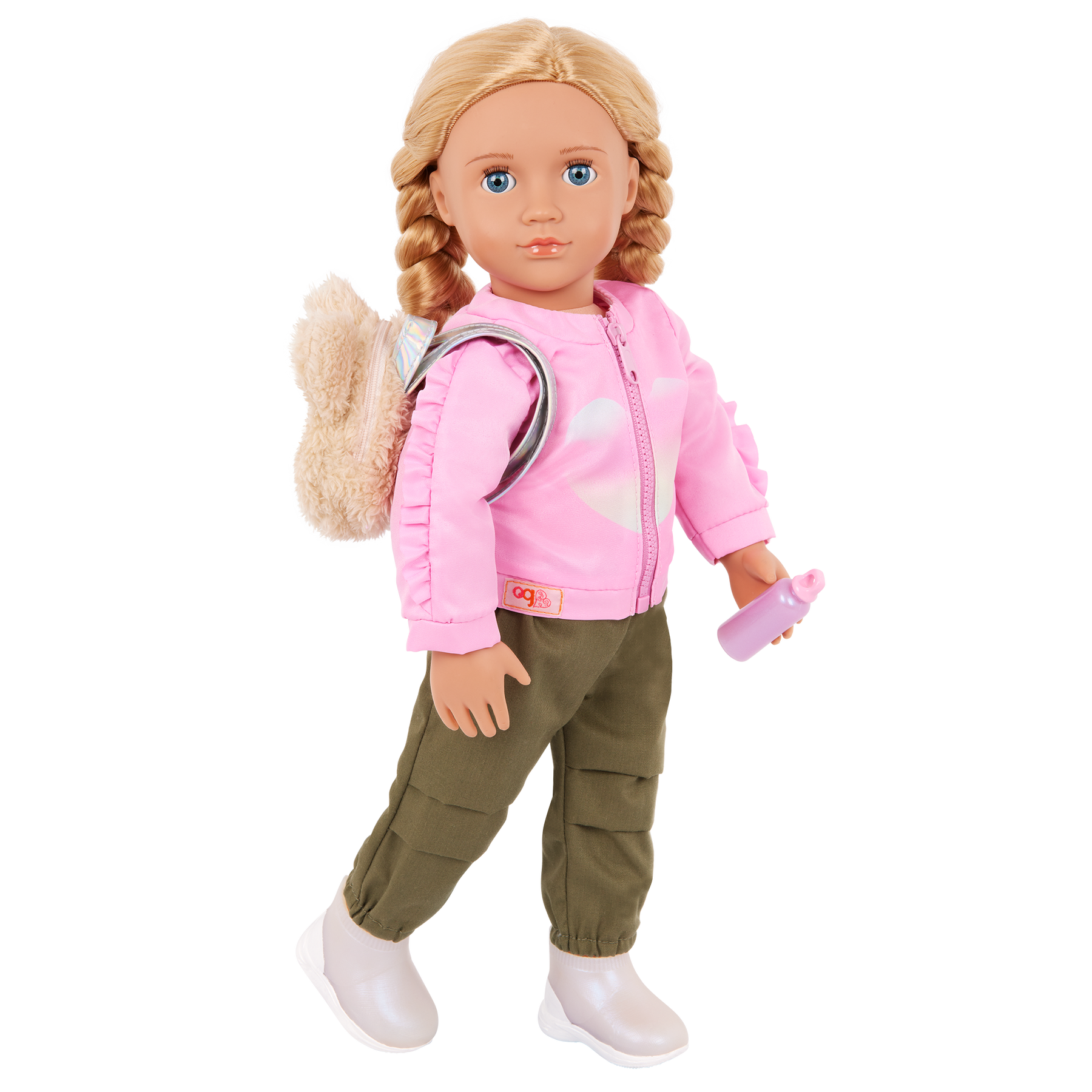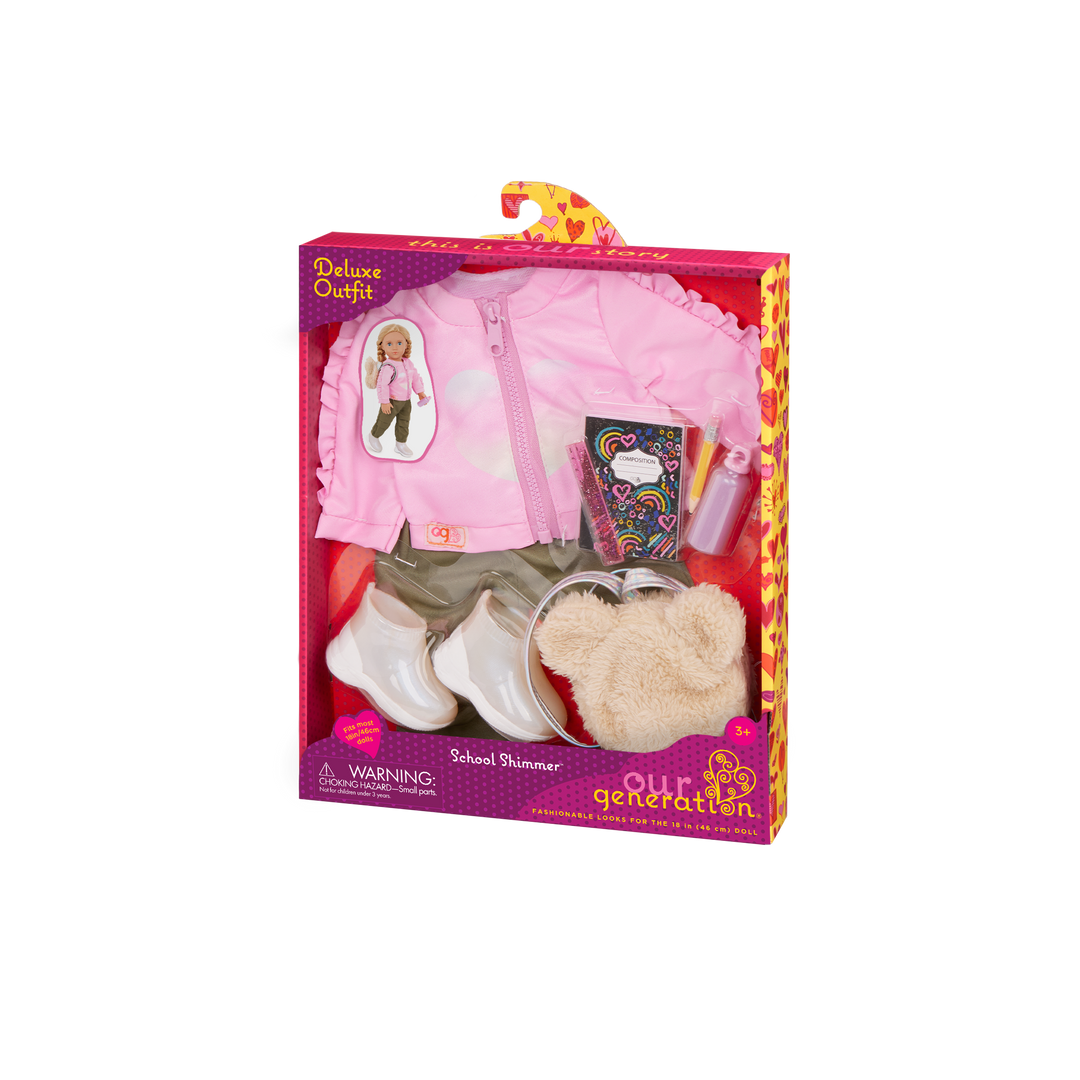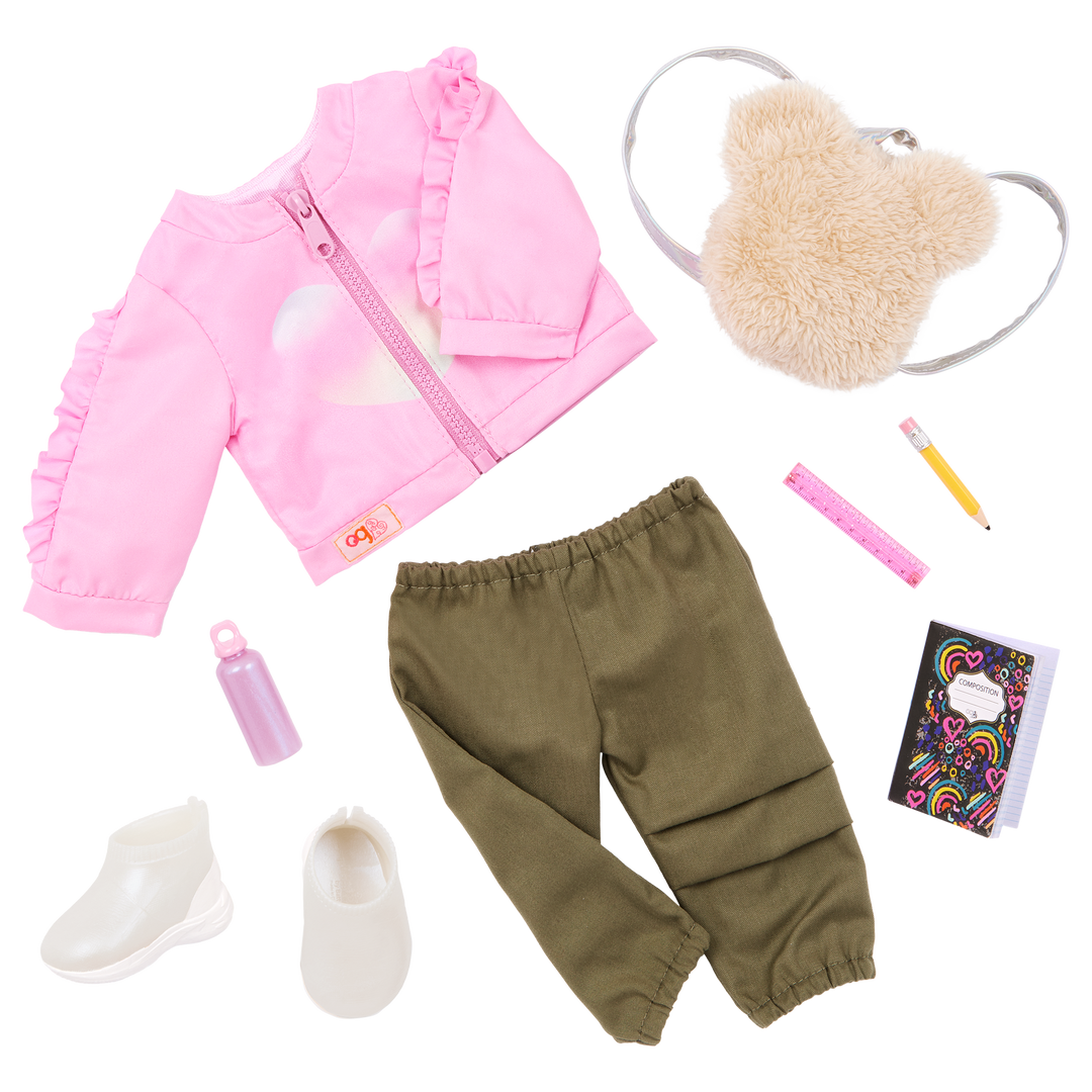 Explore cute styles and fashion fun with the Our Generation School Shimmer outfit! This 18-inch doll clothing set includes a pink zip-up jacket designed with pretty frills on the sleeves and a heart print on the front. It also comes with casual pants and running shoes for a complete outdoorsy look. Themed accessories like a soft, bear-themed backpack and school supplies add to the storytelling as kids pack the notebook, pencil, ruler, and water bottle for school days! When it's time for dress-up, this 18-inch doll outfit has easy-open closures to quickly put on and remove. So kids can mix, match, and create more stylish looks as they explore imagination and self-expression. Our Generation 18-inch doll clothes make a great gift for kids ages 3 years old and up (small parts), encouraging them to create their own unique stories. Compatible with most 18-inch dolls, doll clothes, and accessories. Our Generation dolls sold separately.