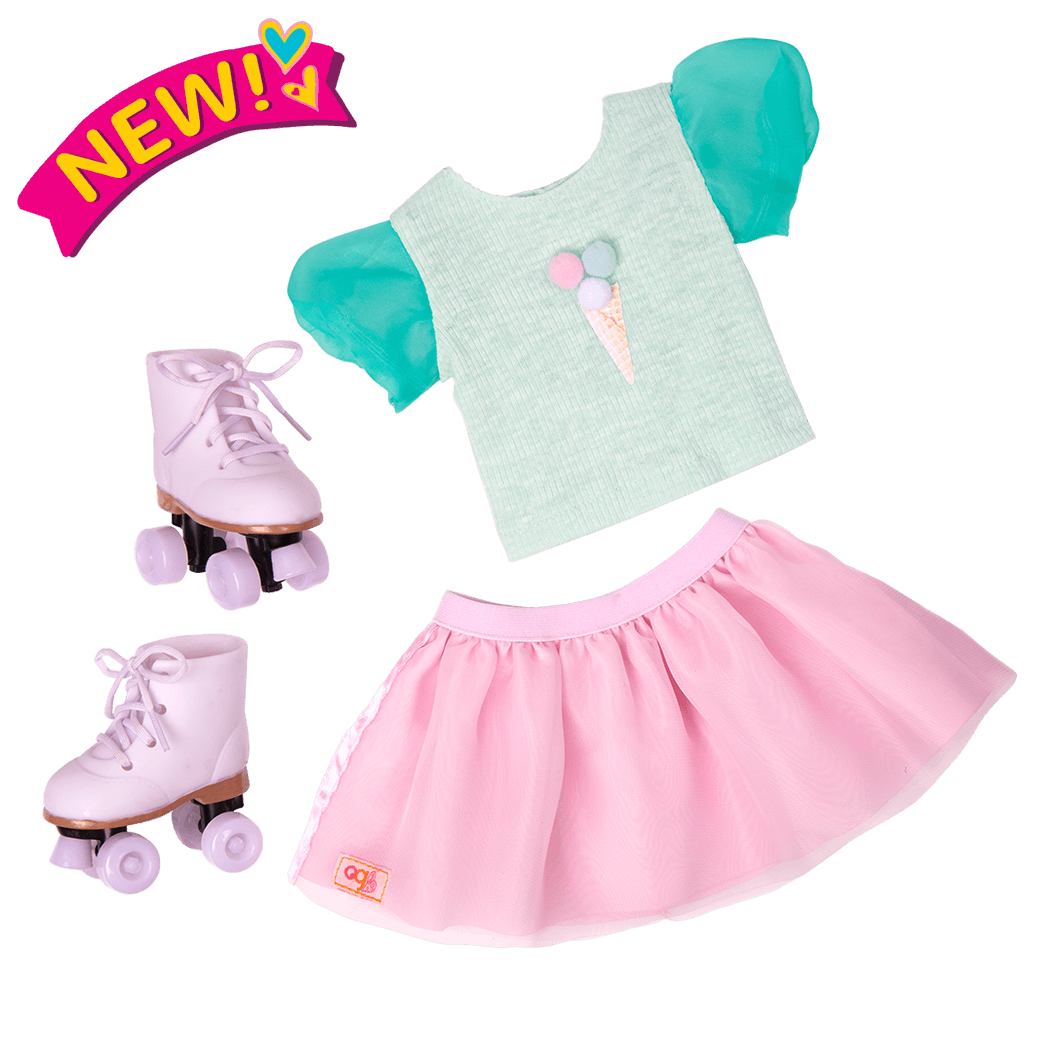 One scoop fashion, two scoops fun! The Our Generation Scoopalicious ice cream outfit for 18-inch dolls features easy-open closures that make it quick to put on and remove. Dress your bestie in the colorful top with a decorative ice cream embroidery and pom pom scoops, then add the bright pink ruffle skirt to complete the look. Don't forget the pink roller skates! They add an extra touch of fun to your doll's fashion wardrobe, and they can also be paired with many Our Generation clothing sets, so your dolls can roll around the neighborhood in the cutest colors! (Dolls sold separately)
