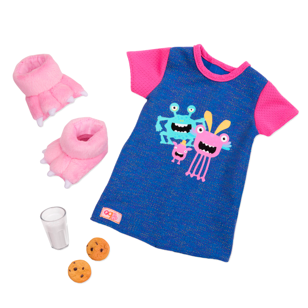Make best friends with adorable bedtime critters in the Snuggle Monster Pajama Outfit from Our Generation! These doll clothes for 18-inch dolls are perfect for the snuggle monster in your life, and show that some cuddly monsters are lots and lots of fun! Dress your favorite dolls in the bright blue and pink nightdress with an adorable cartoon monster print on the front, and finish off the look with a pair of oversized plush slippers in the shape of monster toes. What do hungry snuggle monsters like to eat before bed? Cookies and milk, of course! Treat your dolls to a bedtime snack so that their monster tummies won't be growling in the night. From sleepovers to just sleeping, the Snuggle Monster pajamas will make sure your dolls have sweet dreams. (Dolls sold separately)