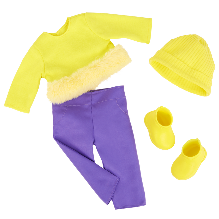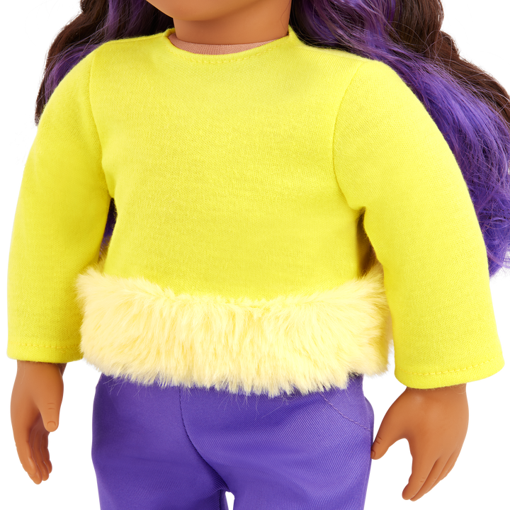 Friendship and fashion shine bright with Our Generation 18-inch doll Sola! Dressed in vibrant colors, she wears a yellow top with a faux-fur trim, a matching beanie hat, purple pants, and yellow shoes that complete this cute "color blocking" effect. Color-blocking outfits let creative fashion fans add cheery colors to their doll's wardrobe as they explore storytelling and self-expression. Sola has a huggable soft body and lifelike features that will delight doll fans during playtime. Her beautiful hazel eyes open and close, and her wavy brown hair has purple peekaboo highlights for extra bright styles! When it's time for dress-up, her outfit has easy-open closures to quickly put on and remove. So you can mix, match, and create even more stylish looks on any adventure! Our Generation dolls make a great gift for kids ages 3+ (small parts), encouraging them to imagine their own unique stories.