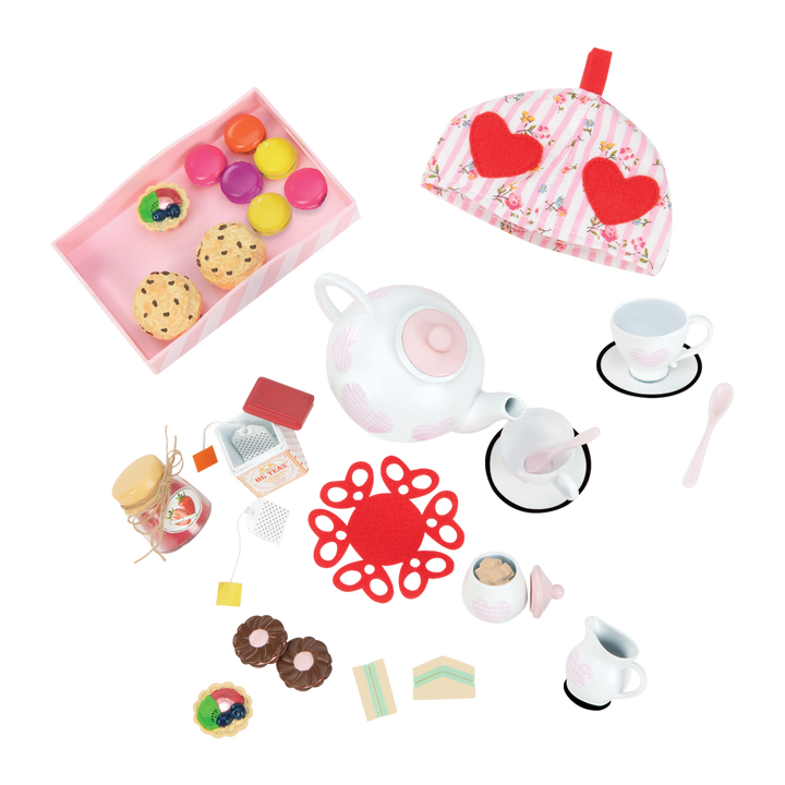 Serve up hours of delightful fun with Tea for Two, the perfect miniature tea party accessory set for 18-inch dolls! Pour the perfect cup for your doll friends. The cute tea service features pink hearts on the tea pot, 2 tea cups, creamer and sugar bowl, and cute red hearts on the fabric tea cozy. Use the serving tray to present an array of treats so sweet they look good enough to eat, including miniature pastries, cookies, sandwiches, and more. You'll be impressed with the lifelike details of this tea party for 18-inch dolls. (Dolls, table and chairs sold separately)